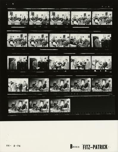 | Keywords: Ford B0055 NLGRF photo contact sheet (1976-06-01)(Gerald Ford Library).jpg White House Photographic Office WHPO is housed at the Gerald R Ford Presidential Library a branch of the National Archives and Records Administration NARA <br/><br/> This file is a 200 dpi photo contact sheet having images from roll of film B0055 of the August 9 1974 - January 20 1977 Gerald R Ford White House Photographic Office Series A0001-A9999 and B0001-B2886 photographs <br/><br/> The date on the photo contact sheet is the date the roll of film was processed not necessarily the date the photographs were taken See table below for additional details 1976-06-01 Gerald R Ford Presidential Library Image http //www fordlibrarymuseum gov/library/whphotos/B0055_NLGRF jpg B0055_NLGRF jpg from http //www fordlibrarymuseum gov/library/whphotos/19760601whpo pdf White House Photographs June 1 1976 of the http //www fordlibrarymuseum gov/Library/whphotos/whpo asp White House Photographic Collection page White House Photographic Office WHPO - Fitz-Patrick PD-USGov Institution Institution Gerald R Ford Presidential Library Table wikitable sortable + Photo contact sheet B0055 U S President Ford Administration Gerald R Ford Library Frame s Tone Subject proper Subject generic Names Geographic Location Photographer Date - 3-11 BW Interview with California Newspaper Correspondents seated in circle near fireoplace; various angles and distances GRF Joseph Albright Bill Broom Gil Bailey Frank Kane Richard Maloy Edward Neilan L Edgar Prina Jack Nelson Andy Abramson Thomas Ochiltree Oval Office Fitz-Patrick 1976-06-01 - 12-14 BW Prior to Interview with Dayton Ohio OH News Anchorman greeting handshaking standing talking GRF Wesley Bouslog Don Wayne President's Private Office Fitz-Patrick 1976-06-01 - 15-18 BW Prior to Interview with Dayton Ohio OH News Anchorman GRF greeting handshaking with TV crew; Bouslog standing on right of frame; Nessen and Mead in background GRF Wesley Bouslog Don Wayne WHIO-TV Crew Members; Nessen Mead Oval Office Fitz-Patrick 1976-06-01 - 19-25 BW Prior to Interview with WJW-TV Cleveland Ohio OH Co-Anchors standing talking GRF Jeff Maynor James Hale Ground Floor -Map Room Fitz-Patrick 1976-06-01 Gerald R Ford Presidential Library and Museum-cooperation PD-USGov Contact sheets by the Ford White House June 1976 |