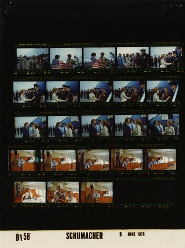 | Keywords: Ford B0158 NLGRF photo contact sheet (1976-06-07)(Gerald Ford Library).jpg White House Photographic Office WHPO is housed at the Gerald R Ford Presidential Library a branch of the National Archives and Records Administration NARA <br/><br/> This file is a 200 dpi photo contact sheet having images from roll of film B0158 of the August 9 1974 - January 20 1977 Gerald R Ford White House Photographic Office Series A0001-A9999 and B0001-B2886 photographs <br/><br/> The date on the photo contact sheet is the date the roll of film was processed not necessarily the date the photographs were taken See table below for additional details 1976-06-07 Gerald R Ford Presidential Library Image http //www fordlibrarymuseum gov/library/whphotos/B0158_NLGRF jpg B0158_NLGRF jpg from http //www fordlibrarymuseum gov/library/whphotos/19760607whpo pdf White House Photographs June 7 1976 of the http //www fordlibrarymuseum gov/Library/whphotos/whpo asp White House Photographic Collection page White House Photographic Office WHPO - Schumacher PD-USGov Institution Institution Gerald R Ford Presidential Library Table wikitable sortable + Photo contact sheet B0158 U S President Ford Administration Gerald R Ford Library Frame s Tone Subject proper Subject generic Names Geographic Location Photographer Date - 2A Color First Lady's Campaign Trip to California; Prior to Departure for Grand Rapids Michigan - Burbank California BF speaking into microphone; media on right of frame behind rope; Secret Service in background Betty Ford Media; Secret Service Burbank CA Hollywood Burbank Airport Schumacher 1976-06-07 - 3A-4A Color First Lady's Campaign Trip to California; Prior to Departure for Grand Rapids Michigan - Burbank California standing behind outstretched U S flag; C-9 Convair Aircraft in background in frame 4A Betty Ford Unidentified Woman Burbank CA Hollywood Burbank Airport Schumacher 1976-06-07 - 5A-11A Color First Lady's Campaign Trip to California; Prior to Departure for Grand Rapids Michigan - Burbank California handshaking saying goodbye; all not in every frame; C-9 Convair Aircraft in background in all but frame 5A Betty Ford Police Officers Others Burbank CA Hollywood Burbank Airport Schumacher 1976-06-07 - 12A-16A Color First Lady's Campaign Trip to California; Prior to Departure for Grand Rapids Michigan - Burbank California handshaking saying goodbye; all not in every frame; C-9 Convair Aircraft in background Betty Ford Others Burbank CA Hollywood Burbank Airport Schumacher 1976-06-07 - 17A-18A Color First Lady's Trip to Michigan -Flight from California to Grand Rapids Michigan seated reading; long view down center aisle of C-9 Convair Aircraft; East Wing Staff Patty Young Unidentified Man C-9 Convair Aircraft Schumacher 1976-06-07 - 19A-22A Color First Lady's Trip to Michigan -Flight from California to Grand Rapids Michigan Young and Man seated reading; Cavaney taking pictures; all not in every frame; East Wing Staff Patty Young Unidentified Man Cavaney; Others C-9 Convair Aircraft Schumacher 1976-06-07 - 23A Color First Lady's Trip to Michigan -Flight from California to Grand Rapids Michigan seated; one man using Cavaney's camera; East Wing Staff Patty Young Unidentified Man Cavaney; Others C-9 Convair Aircraft Schumacher 1976-06-07 - 24A Color First Lady's Trip to Michigan -Flight from California to Grand Rapids Michigan seated; long view down center aisle of C-9 Convair Aircraft; East Wing Staff Patty Young Unidentified Man C-9 Convair Aircraft Schumacher 1976-06-07 Gerald R Ford Presidential Library and Museum-cooperation PD-USGov Contact sheets by the Ford White House June 1976 |