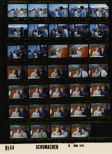 Keywords: Ford B0164 NLGRF photo contact sheet (1976-06-08)(Gerald Ford Library).jpg White House Photographic Office WHPO is housed at the Gerald R Ford Presidential Library a branch of the National Archives and Records Administration NARA <br/><br/> This file is a 200 dpi photo contact sheet having images from roll of film B0164 of the August 9 1974 - January 20 1977 Gerald R Ford White House Photographic Office Series A0001-A9999 and B0001-B2886 photographs <br/><br/> The date on the photo contact sheet is the date the roll of film was processed not necessarily the date the photographs were taken See table below for additional details 1976-06-08 Gerald R Ford Presidential Library Image http //www fordlibrarymuseum gov/library/whphotos/B0164_NLGRF jpg B0164_NLGRF jpg from http //www fordlibrarymuseum gov/library/whphotos/19760608whpo pdf White House Photographs June 8 1976 of the http //www fordlibrarymuseum gov/Library/whphotos/whpo asp White House Photographic Collection page White House Photographic Office WHPO - Schumacher PD-USGov Institution Institution Gerald R Ford Presidential Library Table wikitable sortable + Photo contact sheet B0164 U S President Ford Administration Gerald R Ford Library Frame s Tone Subject proper Subject generic Names Geographic Location Photographer Date - 2A-3A Color First Lady's Campaign Trip to Michigan standing talking handshaking Betty Ford Unidentified Man Grand Rapids MI Unidentified Location Schumacher 1976-06-08 - 4A-5A Color First Lady's Campaign Trip to Michigan - Prior to Departure for Andrews Air Force Base standing talking handshaking; C-9 Convair Aircraft in background Betty Ford Unidentified Man Grand Rapids MI Kent County Airport Schumacher 1976-06-08 - 6A Color First Lady's Campaign Trip to Michigan - Prior to Departure for Andrews Air Force Base standing talking handshaking; C-9 Convair Aircraft in background Betty Ford Unidentified Man Grand Rapids MI Kent County Airport Schumacher 1976-06-08 - 7A Color First Lady's Campaign Trip to Michigan - Prior to Departure for Andrews Air Force Base standing talking handshaking; C-9 Convair Aircraft in background Betty Ford Unidentified Man Grand Rapids MI Kent County Airport Schumacher 1976-06-08 - 8A-13A Color First Lady's Campaign Trip to Michigan - Prior to Departure for Andrews Air Force Base standing talking handshaking; various distances; all not in every frame; C-9 Convair Aircraft in background Betty Ford Unidentified Men Michigan State Police Officers Grand Rapids MI Kent County Airport Schumacher 1976-06-08 - 14A-15A Color Flight for Grand Rapids Michigan to Andrews Air Force Base BF seated turning to face camera; wearing faux straw hat that reads The Backroom Saloon on the hatband; woman seated in background holding magazine laughing Betty Ford; Unidentified Woman C-9 Convair Aircraft Schumacher 1976-06-08 - 16A-17A Color Flight for Grand Rapids Michigan to Andrews Air Force Base seated side by side posing; man has patch on blazer Betty Ford; Unidentified Man C-9 Convair Aircraft Schumacher 1976-06-08 - 18A-19A Color Flight for Grand Rapids Michigan to Andrews Air Force Base seated side by side posing; man has patch on blazer Betty Ford; Unidentified Man C-9 Convair Aircraft Schumacher 1976-06-08 - 20A-21A Color Flight for Grand Rapids Michigan to Andrews Air Force Base seated side by side posing; name tag may read Bookman Betty Ford; Unidentified Man Bookman C-9 Convair Aircraft Schumacher 1976-06-08 - 22A-23A Color Flight for Grand Rapids Michigan to Andrews Air Force Base seated side by side posing Betty Ford; Unidentified Air Force E-6 Technical Sergeant C-9 Convair Aircraft Schumacher 1976-06-08 - 24A-25A Color Flight for Grand Rapids Michigan to Andrews Air Force Base seated side by side posing Betty Ford; Unidentified Air Force E-6 Technical Sergeant C-9 Convair Aircraft Schumacher 1976-06-08 - 26A-27A Color Flight for Grand Rapids Michigan to Andrews Air Force Base seated side by side posing Betty Ford; Unidentified Air Force E-6 Technical Sergeant C-9 Convair Aircraft Schumacher 1976-06-08 - 28A-29A Color Flight for Grand Rapids Michigan to Andrews Air Force Base seated side by side posing Betty Ford; Unidentified Air Force E-6 Technical Sergeant C-9 Convair Aircraft Schumacher 1976-06-08 - 30A-31A Color Flight for Grand Rapids Michigan to Andrews Air Force Base seated side by side posing; man has patch on blazer Betty Ford; Unidentified Man C-9 Convair Aircraft Schumacher 1976-06-08 - 32A-33A Color Flight for Grand Rapids Michigan to Andrews Air Force Base seated side by side posing; man has patch on blazer Betty Ford; Unidentified Man C-9 Convair Aircraft Schumacher 1976-06-08 - 34A-35A Color Flight for Grand Rapids Michigan to Andrews Air Force Base seated side by side posing; man has patch on blazer Betty Ford; Unidentified Man C-9 Convair Aircraft Schumacher 1976-06-08 Gerald R Ford Presidential Library and Museum-cooperation PD-USGov Contact sheets by the Ford White House June 1976 |