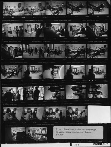 | Keywords: Ford B0251 NLGRF photo contact sheet (1976-06-16)(Gerald Ford Library).jpg White House Photographic Office WHPO is housed at the Gerald R Ford Presidential Library a branch of the National Archives and Records Administration NARA <br/><br/> This file is a 200 dpi photo contact sheet having images from roll of film B0251 of the August 9 1974 - January 20 1977 Gerald R Ford White House Photographic Office Series A0001-A9999 and B0001-B2886 photographs <br/><br/> The date on the photo contact sheet is the date the roll of film was processed not necessarily the date the photographs were taken See table below for additional details 1976-06-16 Gerald R Ford Presidential Library Image http //www fordlibrarymuseum gov/library/whphotos/B0251_NLGRF jpg B0251_NLGRF jpg from http //www fordlibrarymuseum gov/library/whphotos/19760616whpo pdf White House Photographs June 16 1976 of the http //www fordlibrarymuseum gov/Library/whphotos/whpo asp White House Photographic Collection page White House Photographic Office WHPO <br/> Creator David Hume Kennerly PD-USGov Institution Institution Gerald R Ford Presidential Library Table wikitable sortable + Photo contact sheet B0251 U S President Ford Administration Gerald R Ford Library Frame s Tone Subject proper Subject generic Names Geographic Location Photographer Date - 2-3 B Meeting with Member of the President's Foreign Intelligence Advisory Board PFIAB seated talking on sofas near fireplace GRF John Connally Oval Office Kennerly 1976-06-16 - 4-6 B Meeting with the Counsellor to the Vice President seated around desk talking GRF Raymond Shafer Oval Office Kennerly 1976-06-16 - 7 B Prior to Meeting with President Ford Committee Leadership Nessen Scowcroft and Raoul-Duval standing together looking at document; man on right of frame back to camera Nessen Scowcroft Raoul-Duval Unidentified Man Scheduling and Advance Office Kennerly 1976-06-16 - 8 B Prior to Meeting with President Ford Committee Leadership standing talking; Scowcroft holding document Nessen Scowcroft Scheduling and Advance Office Kennerly 1976-06-16 - 9-10 B Prior to Meeting with President Ford Committee Leadership O'Donnell in foreground; Cheney and Man reading documents; others in background O'Donnell Unidentified Man Cheney; Others Scheduling and Advance Office Kennerly 1976-06-16 - 11-12 B Prior to Meeting with President Ford Committee Leadership O'Donnell and Spencer in foreground standing talking; others standing in background taling in group O'Donnell Stuart Spencer; Unidentified Man Cheney Raoul-Duval Others Scheduling and Advance Office Kennerly 1976-06-16 - 13-14 B Meeting with Senior Staff and Chairman of the President Ford Committee GRF seated at desk; others walking toward chairs taking seats GRF Cheney Scowcroft Morton Nessen Hartmann Oval Office Kennerly 1976-06-16 - 15-21 B Meeting with Senior Staff and Chairman of the President Ford Committee seated around desk talking; various angles and distances GRF Cheney Scowcroft Morton Nessen Hartmann Oval Office Kennerly 1976-06-16 - 22 B Beirut Lebanon Crisis - Meeting of the National Security Council standing talking; Brown's back to camera Kissinger Scowcroft George Brown Cabinet Room Kennerly 1976-06-17 - 23 B Beirut Lebanon Crisis - Meeting of the National Security Council standing talking; Kissinger leaning on table; Brown's back to camera Bush Kissinger Clements George Brown Cabinet Room Kennerly 1976-06-17 - 24-26 B Beirut Lebanon Crisis - Meeting of the National Security Council standing talking; Kissinger leaning on table; Bush reading document; Brown's back to camera Bush Kissinger George Brown Cabinet Room Kennerly 1976-06-17 - 27 B Beirut Lebanon Crisis - Meeting of the National Security Council Brown in foreground next to chart; Kissinger looking toward Scowcroft; Bush uncovering 2nd chart in background; only Scowcroft facing camera L Dean Brown Kissinger Scowcroft Bush Cabinet Room Kennerly 1976-06-17 - 28 B Beirut Lebanon Crisis - Meeting of the National Security Council Brown in foreground next to chart; Bush uncovering 2nd chart in background; none facing camera L Dean Brown Kissinger Bush Cabinet Room Kennerly 1976-06-17 - 29-30 B Beirut Lebanon Crisis - Meeting of the National Security Council standing around table talking; George Brown speaking gesturing in 1st frame Kissinger speaking gesturing in 2nd frame; charts on right side of frame George Brown L Dean Brown Kissinger Bush Scowcroft Cabinet Room Kennerly 1976-06-17 - 31 B REDACTED Cabinet Room Kennerly 1976-06-17 - 32 B Beirut Lebanon Crisis - Meeting of the National Security Council standing near table; taken from between charts on easels; Bush on right side of frame partially obscured by chart GRF L Dean Brown Kissinger Clements; Bush Cabinet Room Kennerly 1976-06-17 - 33 B Beirut Lebanon Crisis - Meeting of the National Security Council seated around table; maps on easel near fireplace; taken from side opposite GRF GRF George Brown L Dean Brown Kissinger Bush Scowcroft Clements Cheney Cabinet Room Kennerly 1976-06-17 Gerald R Ford Presidential Library and Museum-cooperation PD-USGov Contact sheets by the Ford White House June 1976 Photographs by David Hume Kennerly from 1976 |