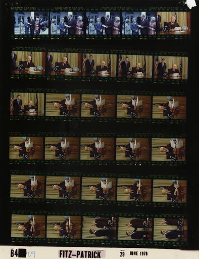 | Keywords: Ford B0409 NLGRF photo contact sheet (1976-06-29)(Gerald Ford Library).jpg White House Photographic Office WHPO is housed at the Gerald R Ford Presidential Library a branch of the National Archives and Records Administration NARA <br/><br/> This file is a 200 dpi photo contact sheet having images from roll of film B0409 of the August 9 1974 - January 20 1977 Gerald R Ford White House Photographic Office Series A0001-A9999 and B0001-B2886 photographs <br/><br/> The date on the photo contact sheet is the date the roll of film was processed not necessarily the date the photographs were taken See table below for additional details 1976-06-29 Gerald R Ford Presidential Library Image http //www fordlibrarymuseum gov/library/whphotos/B0409_NLGRF jpg B0409_NLGRF jpg from http //www fordlibrarymuseum gov/library/whphotos/19760629whpo pdf White House Photographs June 29 1976 of the http //www fordlibrarymuseum gov/Library/whphotos/whpo asp White House Photographic Collection page White House Photographic Office WHPO - Fitz-Patrick PD-USGov Institution Institution Gerald R Ford Presidential Library Table wikitable sortable + Photo contact sheet B0409 U S President Ford Administration Gerald R Ford Library Frame s Tone Subject proper Subject generic Names Geographic Location Photographer Date - 3-6 Color Bicentennial Event - Meeting with the Board of Directors of American Revolution Bicentennial Administration ARBA Advisory Council and Federal Agency Bicentennial Task Force - Administrator ARBA standing near microphone talking; Warner in 1st frame only GRF John Warner Unidentified Man Unidentified women Rose Garden Fitz-Patrick 1976-06-29 - 7-12 Color Bicentennial Event - Signing the Fourth of July Proclamation - Administrator American Revolution Bicentennial Administration ARBA GRF seated at desk speaking holding document; Warner standing behind GRF's right shoulder GRF John Warner Oval Office Fitz-Patrick 1976-06-29 - 13-25 Color Bicentennial Event - Signing the Fourth of July Proclamation seated at desk speaking holding document GRF Oval Office Fitz-Patrick 1976-06-29 - 26-29 Color Bicentennial Event - Signing the Fourth of July Proclamation seated at desk signing document GRF Oval Office Fitz-Patrick 1976-06-29 - 30-32 Color Bicentennial Event - Following Signing the Fourth of July Proclamation - Administrator American Revolution Bicentennial Administration ARBA standing behind desk talking smiling GRF John Warner Oval Office Fitz-Patrick 1976-06-29 Gerald R Ford Presidential Library and Museum-cooperation PD-USGov Contact sheets by the Ford White House June 1976 |