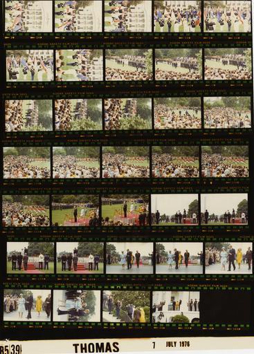 | Keywords: Ford B0539 NLGRF photo contact sheet (1976-07-07)(Gerald Ford Library).jpg White House Photographic Office WHPO is housed at the Gerald R Ford Presidential Library a branch of the National Archives and Records Administration NARA <br/><br/> This file is a 200 dpi photo contact sheet having images from roll of film B0539 of the August 9 1974 - January 20 1977 Gerald R Ford White House Photographic Office Series A0001-A9999 and B0001-B2886 photographs <br/><br/> The date on the photo contact sheet is the date the roll of film was processed not necessarily the date the photographs were taken See table below for additional details 1976-07-07 Gerald R Ford Presidential Library Image http //www fordlibrarymuseum gov/library/whphotos/B0539_NLGRF jpg B0539_NLGRF jpg from http //www fordlibrarymuseum gov/library/whphotos/19760707whpo pdf White House Photographs July 7 1976 of the http //www fordlibrarymuseum gov/Library/whphotos/whpo asp White House Photographic Collection page White House Photographic Office WHPO - Thomas PD-USGov Institution Institution Gerald R Ford Presidential Library Table wikitable sortable + Photo contact sheet B0539 U S President Ford Administration Gerald R Ford Library Frame s Tone Subject proper Subject generic Names Geographic Location Photographer Date - 2-8 Color State Arrival Ceremony in Honor of Queen Elizabeth II and Prince Philip GRF and QEII standing on podium for anthems; GRF's hand over heart; trumpeters standing on Truman Balcony; Guard and crowd in foreground; long shots taken from behind Honor Guard GRF Queen Elizabeth II Betty Ford Prince Philip; Herald Trumpeters Honor Guard; Crowd South Lawn Thomas 1976-07-07 - 9-14 Color State Arrival Cerremony for Queen Elizabeth II and Prince Philip GRF QEII Aide and Captain reviewing Honor Guard; moving toward camera; long shots from west to east; all not in frames GRF Queen Elizabeth II; Captain of the Honor Guard British Military Aide Honor Guard South Lawn Thomas 1976-07-07 - 15-16 Color State Arrival Cerremony for Queen Elizabeth II and Prince Philip GRF QEII Aide and Captain walking toward podium backs to camera; crowd on left of frame; long shots from west to east; all not in frames GRF Queen Elizabeth II; Captain of the Honor Guard British Military Aide; Crowd South Lawn Thomas 1976-07-07 - 17-22 Color State Arrival Ceremony in Honor of Queen Elizabeth II and Prince Philip GRF and QEII on podium blending into crowd; band marching between lectern and Honor Guard; crowd surrounding field; long shot taken from west to east GRF Queen Elizabeth II Honor Guard Marine Band; Crowd South Lawn Thomas 1976-07-07 - 23-24 Color State Arrival Ceremony in Honor of Queen Elizabeth II and Prince Philip GRF and QEII on podium GRF speaking; Guard in background; telephoto taken from Truman Balcony; 4x5 negative GRF Queen Elizabeth II Honor Guard; Crowd South Lawn Thomas 1976-07-07 - 25-28 Color State Arrival Ceremony in Honor of Queen Elizabeth II and Prince Philip GRF and QEII on podium QEII speaking; Guard in background; telephoto taken from Truman Balcony; 4x5 negative GRF Queen Elizabeth II Honor Guard; Crowd South Lawn Thomas 1976-07-07 - 29-32 Color State Arrival Ceremony in Honor of Queen Elizabeth II and Prince Philip GRF QEII Betty Ford Prince Philip walking in pairs talking moving toward camera; crowd in background GRF Queen Elizabeth II Betty Ford Prince Philip; Crowd South Driveway Thomas 1976-07-07 - 33 Color State Arrival Ceremony in Honor of Queen Elizabeth II and Prince Philip standing talking smiling; crowd in background GRF Queen Elizabeth II; Crowd South Driveway Thomas 1976-07-07 - 34 Color State Arrival Ceremony in Honor of Queen Elizabeth II and Prince Philip ascending steps to Truman Balcony; Trumpeters lining steps GRF Queen Elizabeth II Betty Ford Prince Philip; Herald Trumpeters Steps to Truman Balcony Thomas 1976-07-07 - 35 Color State Arrival Ceremony in Honor of Queen Elizabeth II and Prince Philip GRF QEII Betty Ford Prince Philip standing between pillars waving to crowd not seen ; Trumpeters on either side of pillars; all not in frame GRF Queen Elizabeth II Betty Ford Prince Philip; Herald Trumpeters Truman Balcony Thomas 1976-07-07 Gerald R Ford Presidential Library and Museum-cooperation PD-USGov Contact sheets by the Ford White House July 1976 |