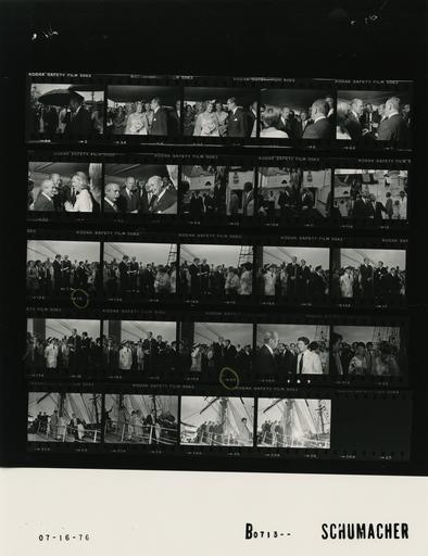 | Keywords: Ford B0713 NLGRF photo contact sheet (1976-07-16)(Gerald Ford Library).jpg White House Photographic Office WHPO is housed at the Gerald R Ford Presidential Library a branch of the National Archives and Records Administration NARA <br/><br/> This file is a 200 dpi photo contact sheet having images from roll of film B0713 of the August 9 1974 - January 20 1977 Gerald R Ford White House Photographic Office Series A0001-A9999 and B0001-B2886 photographs <br/><br/> The date on the photo contact sheet is the date the roll of film was processed not necessarily the date the photographs were taken See table below for additional details 1976-07-16 Gerald R Ford Presidential Library Image http //www fordlibrarymuseum gov/library/whphotos/B0713_NLGRF jpg B0713_NLGRF jpg from http //www fordlibrarymuseum gov/library/whphotos/19760716whpo pdf White House Photographs July 16 1976 of the http //www fordlibrarymuseum gov/Library/whphotos/whpo asp White House Photographic Collection page White House Photographic Office WHPO - Schumacher PD-USGov Institution Institution Gerald R Ford Presidential Library Table wikitable sortable + Photo contact sheet B0713 U S President Ford Administration Gerald R Ford Library Frame s Tone Subject proper Subject generic Names Geographic Location Photographer Date - 3 BW Arrival for Reception in Honor of the President and First Lady Hosted by Chancellor Helmut Mrs Loki Schmidt Aboard Gorch Fock German Tall Ship walking GRF under umbrella GRF Others Baltimore MD Inner Harbor Schumacher 1976-07-16 - 4-5 BW Reception in Honor of the President and First Lady Hosted by Chancellor Helmut Schmidt Mrs Loki Aboard Gorch Fock German Tall Ship BF and man standing talking; others in background Betty Ford Unidentified Man Others Baltimore MD Onboard Gorch Fock German Tall Ship Schumacher 1976-07-16 - 6-9 BW Reception in Honor of the President and First Lady Hosted by Chancellor Helmut Schmidt Mrs Loki Aboard Gorch Fock German Tall Ship greeting handshaking standing talking; various anglews and distances; all not in every frame GRF Helmut Schmidt Others Baltimore MD Onboard Gorch Fock German Tall Ship Schumacher 1976-07-16 - 10-12 BW Reception in Honor of the President and First Lady Hosted by Chancellor Helmut Schmidt Mrs Loki Aboard Gorch Fock German Tall Ship walking talking descending ladder; touring ship; all not in every frame GRF Helmut Schmidt Others Baltimore MD Onboard Gorch Fock German Tall Ship Schumacher 1976-07-16 - 13-15 BW Reception in Honor of the President and First Lady Hosted by Chancellor Helmut Schmidt Mrs Loki Aboard Gorch Fock German Tall Ship GRF and Schmidt at microphone Schmidt talking; others in background; sail rigging in background GRF Helmut Schmidt Others Baltimore MD Onboard Gorch Fock German Tall Ship Schumacher 1976-07-16 - 16-20 BW Reception in Honor of the President and First Lady Hosted by Chancellor Helmut Schmidt Mrs Loki Aboard Gorch Fock German Tall Ship GRF and Schmidt at microphone GRF talking; others in background; sail rigging in background GRF Helmut Schmidt Others Baltimore MD Onboard Gorch Fock German Tall Ship Schumacher 1976-07-16 - 21 BW Reception in Honor of the President and First Lady Hosted by Chancellor Helmut Schmidt Mrs Loki Aboard Gorch Fock German Tall Ship GRF and man talking; others in background; sail rigging in background GRF Unidentified Man; Others Baltimore MD Onboard Gorch Fock German Tall Ship Schumacher 1976-07-16 - 22 BW Reception in Honor of the President and First Lady Hosted by Chancellor Helmut Schmidt Mrs Loki Aboard Gorch Fock German Tall Ship BF and Schmidt talking; others in background; sail rigging in background Betty Ford Loki Schmidt Others Baltimore MD Onboard Gorch Fock German Tall Ship Schumacher 1976-07-16 - 23-24 BW Following Reception in Honor of the President and First Lady Hosted by Chancellor Helmut Schmidt Mrs Loki Aboard Gorch Fock German Tall Ship descending gangway to shore Betty Ford Loki Schmidt Others Baltimore MD Onboard Gorch Fock German Tall Ship Schumacher 1976-07-16 - 25-26 BW Following Reception in Honor of the President and First Lady Hosted by Chancellor Helmut Schmidt Mrs Loki Aboard Gorch Fock German Tall Ship descending gangway to shore; GRF waving GRF Helmut Schmidt Others Baltimore MD Onboard Gorch Fock German Tall Ship Schumacher 1976-07-16 Gerald R Ford Presidential Library and Museum-cooperation PD-USGov Contact sheets by the Ford White House July 1976 |