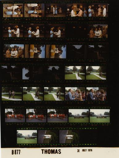 Keywords: Ford B0877 NLGRF photo contact sheet (1976-07-30)(Gerald Ford Library).jpg White House Photographic Office WHPO is housed at the Gerald R Ford Presidential Library a branch of the National Archives and Records Administration NARA <br/><br/> This file is a 200 dpi photo contact sheet having images from roll of film B0877 of the August 9 1974 - January 20 1977 Gerald R Ford White House Photographic Office Series A0001-A9999 and B0001-B2886 photographs <br/><br/> The date on the photo contact sheet is the date the roll of film was processed not necessarily the date the photographs were taken See table below for additional details 1976-07-30 Gerald R Ford Presidential Library Image http //www fordlibrarymuseum gov/library/whphotos/B0877_NLGRF jpg B0877_NLGRF jpg from http //www fordlibrarymuseum gov/library/whphotos/19760730whpo pdf White House Photographs July 30 1976 of the http //www fordlibrarymuseum gov/Library/whphotos/whpo asp White House Photographic Collection page White House Photographic Office WHPO - Schumacher PD-USGov Institution Institution Gerald R Ford Presidential Library Table wikitable sortable + Photo contact sheet B0877 U S President Ford Administration Gerald R Ford Library Frame s Tone Subject proper Subject generic Names Geographic Location Photographer Date - 4-7 Color Prior to Presentation of Stoddard Needlepoint A needlepoint picture of the Alexandria Home of Pres Mrs Ford linen matted off white and in silver antiqued wood frame Meas 16 x 19 greeting handshaking standing talking; only BF in every frame Betty Ford Mrs Waldo Stoddard Mrs Osier Nelson Diplomatic Reception Room Schumacher 1976-07-30 - 8 Color Prior to Presentation of Stoddard Needlepoint A needlepoint picture of the Alexandria Home of Pres Mrs Ford linen matted off white and in silver antiqued wood frame Meas 16 x 19 standing; Stoddard holding framed needlepoint Betty Ford Mrs Waldo Stoddard Mrs Osier Nelson Diplomatic Reception Room Schumacher 1976-07-30 - 9-11 Color Prior to Presentation of Stoddard Needlepoint A needlepoint picture of the Alexandria Home of Pres Mrs Ford linen matted off white and in silver antiqued wood frame Meas 16 x 19 standing BF receiving framed needlepoint Betty Ford Mrs Waldo Stoddard Diplomatic Reception Room Schumacher 1976-07-30 - 12 Color Schumacher 1976-07-30 - 13-14 Color Prior to Presentation of Stoddard Needlepoint A needlepoint picture of the Alexandria Home of Pres Mrs Ford linen matted off white and in silver antiqued wood frame Meas 16 x 19 standing posing; BF holding framed needlepoint Betty Ford Mrs Waldo Stoddard Mrs Osier Nelson Unidentified Man Diplomatic Reception Room Schumacher 1976-07-30 - 15-16 Color Prior to Presentation of Stoddard Needlepoint A needlepoint picture of the Alexandria Home of Pres Mrs Ford linen matted off white and in silver antiqued wood frame Meas 16 x 19 standing posing holding framed needlepoint Betty Ford Diplomatic Reception Room Schumacher 1976-07-30 - 17-26 Color standing talking looking at documents; both holding briefcases Cheney Rumsfeld Sidewalk between Oval Office and South Driveway Schumacher 1976-07-30 - 27-28 Color Meeting on South Driveway GRF greeting handshaking with woman in foreground; others in background GRF Unidentified Woman; Others South Driveway Schumacher 1976-07-30 - 29-31 Color Meeting with Christian Youth Fellowship Bicyclists Who Bicycled from Grand Rapids Michigan to Washington DC standing posing; Truman Balcony South Portico and others in background GRF Betty Ford Christian Youth Fellowship Bicyclists; Others South Driveway Schumacher 1976-07-30 - 32-34 Color Prior to Departure for Andrews Air Force Base Maryland GRF and BF walking up steps to Marine One in 1st frame; standing waving from steps of helicopter in last 2 frames; long shots; Washington Monument in background GRF Betty Ford Others South Lawn Schumacher 1976-07-30 - 35-36 Color Watching Departure of Marine One for Andrews Air Force Base Maryland standing near hedge watching departure of Marine One not shown ; one woman shading eyes with hand Two Unidentified Women South Driveway Schumacher 1976-07-30 Gerald R Ford Presidential Library and Museum-cooperation PD-USGov Contact sheets by the Ford White House July 1976 |