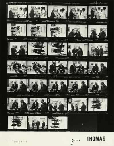 Keywords: Ford B1004 NLGRF photo contact sheet (1976-08-09)(Gerald Ford Library).jpg White House Photographic Office WHPO is housed at the Gerald R Ford Presidential Library a branch of the National Archives and Records Administration NARA <br/><br/> This file is a 200 dpi photo contact sheet having images from roll of film B1004 of the August 9 1974 - January 20 1977 Gerald R Ford White House Photographic Office Series A0001-A9999 and B0001-B2886 photographs <br/><br/> The date on the photo contact sheet is the date the roll of film was processed not necessarily the date the photographs were taken See table below for additional details 1976-08-09 Gerald R Ford Presidential Library Image http //www fordlibrarymuseum gov/library/whphotos/B1004_NLGRF jpg B1004_NLGRF jpg from http //www fordlibrarymuseum gov/library/whphotos/19760809whpo pdf White House Photographs August 9 1976 of the http //www fordlibrarymuseum gov/Library/whphotos/whpo asp White House Photographic Collection page White House Photographic Office WHPO - Thomas PD-USGov Institution Institution Gerald R Ford Presidential Library Table wikitable sortable + Photo contact sheet B1004 U S President Ford Administration Gerald R Ford Library Frame s Tone Subject proper Subject generic Names Geographic Location Photographer Date - 4-11 BW Professional Golfer; Friend of Stockton Family greeting handshaking standing posing; all not in every frame GRF Mr Mrs Dave Stockton; Stockton Children Vicki Bevins Oval Office Thomas 1976-08-09 - 12-18 BW Probate Judge Wayne County Michigan; Former University of Michigan Football Teammate greeting handshaking standing talking GRF Willis Ward Oval Office Thomas 1976-08-09 - 19-30 BW Probate Judge Wayne County Michigan; Former University of Michigan Football Teammate seated talking near fireplace; various angles and distances GRF Willis Ward Oval Office Thomas 1976-08-09 - 31-36 BW Delegate From South Carolina to the Republican National Convention greeting handshaking standing talking posing GRF Raymond Harris Jamie Harris Oval Office Thomas 1976-08-09 Gerald R Ford Presidential Library and Museum-cooperation PD-USGov Contact sheets by the Ford White House August 1976 |