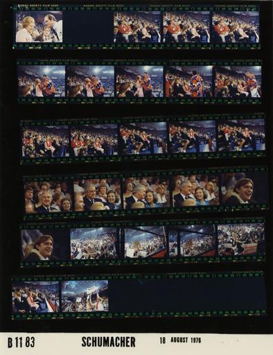 Keywords: Ford B1183 NLGRF photo contact sheet (1976-08-18)(Gerald Ford Library).jpg White House Photographic Office WHPO is housed at the Gerald R Ford Presidential Library a branch of the National Archives and Records Administration NARA <br/><br/> This file is a 200 dpi photo contact sheet having images from roll of film B1183 of the August 9 1974 - January 20 1977 Gerald R Ford White House Photographic Office Series A0001-A9999 and B0001-B2886 photographs <br/><br/> The date on the photo contact sheet is the date the roll of film was processed not necessarily the date the photographs were taken See table below for additional details 1976-08-18 Gerald R Ford Presidential Library Image http //www fordlibrarymuseum gov/library/whphotos/B1183_NLGRF jpg B1183_NLGRF jpg from http //www fordlibrarymuseum gov/library/whphotos/19760818whpo pdf White House Photographs August 18 1976 of the http //www fordlibrarymuseum gov/Library/whphotos/whpo asp White House Photographic Collection page White House Photographic Office WHPO - Schumacher PD-USGov Institution Institution Gerald R Ford Presidential Library Table wikitable sortable + Photo contact sheet B1183 U S President Ford Administration Gerald R Ford Library Frame s Tone Subject proper Subject generic Names Geographic Location Photographer Date - 2A Color Trip to Kansas City Missouri - Convention - 4th Session of the Republican National Convention BF seated; Reporter leaning toward BF talking; Jack in background Betty Ford; Reporter Media Jack Ford Kansas City MO Kemper Arena Schumacher 1976-08-18 - 3A Color Schumacher 1976-08-18 - 4A-6A Color Trip to Kansas City Missouri - Convention - 4th Session of the Republican National Convention seated listening; all not in frames Steve Ford Betty Ford Susan Ford Jack Ford Mike Gayle Ford Tom Janet Ford Dick Ellen Ford Others Kansas City MO Kemper Arena Schumacher 1976-08-18 - 7A-11A Color Trip to Kansas City Missouri - Convention - 4th Session of the Republican National Convention all seated; BF standing in 1st four frames embracing man in some; Men standing near BF wearing red white and blue cow pattern shirts; all not in every frame Steve Ford Betty Ford Susan Ford Jack Ford Unidentified Men Kansas City MO Kemper Arena Schumacher 1976-08-18 - 12A-16A Color Trip to Kansas City Missouri - Convention - 4th Session of the Republican National Convention seated listening laughing; all not in every frame Steve Ford Betty Ford Susan Ford Jack Ford Unidentified Men Kansas City MO Kemper Arena Schumacher 1976-08-18 - 17A-20A Color Trip to Kansas City Missouri - Convention - 4th Session of the Republican National Convention seated talking laughing; others in background; head and shoulder close ups Mr Mrs John Connally Kansas City MO Kemper Arena Schumacher 1976-08-18 - 21A-22A Color Trip to Kansas City Missouri - Convention - 4th Session of the Republican National Convention seated smiling laughing; wearing lei; close up portraits Jack Ford Kansas City MO Kemper Arena Schumacher 1976-08-18 - 23A-26A Color Trip to Kansas City Missouri - Convention - Delegate Demonstration at the 4th Session of the Republican National Convention standing applauding whooping; holding signs; taken from upper level Crowd Kansas City MO Kemper Arena Schumacher 1976-08-18 - 27A Color Trip to Kansas City Missouri - Convention - Delegate Demonstration at the 4th Session of the Republican National Convention seated listening Steve Ford Betty Ford Susan Ford Jack Ford Mike Ford Others Kansas City MO Kemper Arena Schumacher 1976-08-18 - 28A Color Trip to Kansas City Missouri - Convention - Delegate Demonstration at the 4th Session of the Republican National Convention standing applauding whooping; holding signs; taken from upper level Crowd Kansas City MO Kemper Arena Schumacher 1976-08-18 Gerald R Ford Presidential Library and Museum-cooperation PD-USGov Contact sheets by the Ford White House August 1976 |
