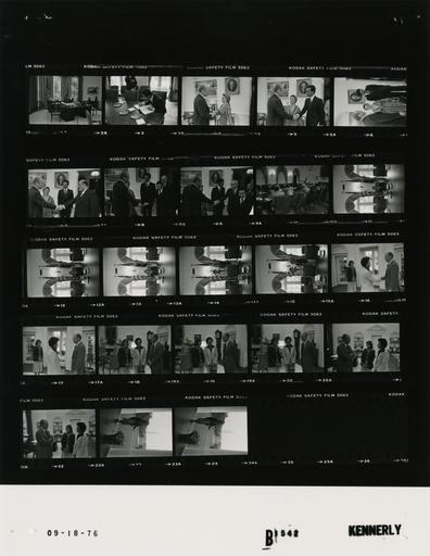 | Keywords: Ford B1542 NLGRF photo contact sheet (1976-09-17)(Gerald Ford Library).jpg White House Photographic Office WHPO is housed at the Gerald R Ford Presidential Library a branch of the National Archives and Records Administration NARA <br/><br/> This file is a 200 dpi photo contact sheet having images from roll of film B1542 of the August 9 1974 - January 20 1977 Gerald R Ford White House Photographic Office Series A0001-A9999 and B0001-B2886 photographs <br/><br/> The date on the photo contact sheet is the date the roll of film was processed not necessarily the date the photographs were taken See table below for additional details 1976-09-17 Gerald R Ford Presidential Library Image http //www fordlibrarymuseum gov/library/whphotos/B1542_NLGRF jpg B1542_NLGRF jpg from http //www fordlibrarymuseum gov/library/whphotos/19760917whpo pdf White House Photographs September 17 1976 of the http //www fordlibrarymuseum gov/Library/whphotos/whpo asp White House Photographic Collection page White House Photographic Office WHPO <br/> Creator David Hume Kennerly PD-USGov Institution Institution Gerald R Ford Presidential Library Table wikitable sortable + Photo contact sheet B1542 U S President Ford Administration Gerald R Ford Library Frame s Tone Subject proper Subject generic Names Geographic Location Photographer Date - 2 BW seated at desk reading smoking pipe; long shot GRF Oval Office Kennerly 1976-09-17 - 3 BW Minister of Foreign Affairs of Saudi Arabia seated at table signing guest book Prince Saud Bin Faisal Al-Saud Cabinet Room Kennerly 1976-09-17 - 4 BW Chief of Protocol greeting handshaking GRF Shirley Temple Black Oval Office Kennerly 1976-09-17 - 5-6 BW Minister of Foreign Affairs of Saudi Arabia; Chief of Protocol greeting handshaking GRF Shirley Temple Black Prince Saud Bin Faisal Al-Saud Oval Office Kennerly 1976-09-17 - 7-9 BW Minister of Foreign Affairs of Saudi Arabia; Ambassador of Saudi Arabia; Deputy Secretary of State; US Ambassador; Chief of Protocol greeting handshaking; all not in frames GRF Shirley Temple Black Prince Saud Bin Faisal Al-Saud Hassan Shawwaf; Ali Abdallah Alireza; Charles Robinson William Porter Scowcroft Oval Office Kennerly 1976-09-17 - 10 BW Meeting to Discuss Non-Proliferation Legislation seated around table; all not in frame GRF; Sens Percy Ribicoff Glenn Pastore Javits; Reps Price Anderson; R Seamans R Fri J Quarles C Robinson Scowcroft Cannon Connor Lynn Marsh Friedersdorf Cabinet Room Kennerly 1976-09-17 - 11-13 BW seated in President's chair Marian Ahalt Cabinet Room Kennerly 1976-09-17 - 14-15 BW standing posing behind President's chair Marian Ahalt; Mrs Ahalt Cabinet Room Kennerly 1976-09-17 - 16-22 BW greeting handshaking standing talking; various angles and distances GRF Marian Ahalt; Mrs Ahalt Oval Office Kennerly 1976-09-17 - 23-24 BW standing arm on rail posing Marian Ahalt Second Floor - Truman Balcony Kennerly 1976-09-17 Gerald R Ford Presidential Library and Museum-cooperation PD-USGov Contact sheets by the Ford White House September 1976 Photographs by David Hume Kennerly from 1976 |