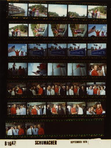 Keywords: Ford B1647 NLGRF photo contact sheet (1976-09-25)(Gerald Ford Library).jpg White House Photographic Office WHPO is housed at the Gerald R Ford Presidential Library a branch of the National Archives and Records Administration NARA <br/><br/> This file is a 200 dpi photo contact sheet having images from roll of film B1647 of the August 9 1974 - January 20 1977 Gerald R Ford White House Photographic Office Series A0001-A9999 and B0001-B2886 photographs <br/><br/> The date on the photo contact sheet is the date the roll of film was processed not necessarily the date the photographs were taken See table below for additional details 1976-09-25 Gerald R Ford Presidential Library Image http //www fordlibrarymuseum gov/library/whphotos/B1647_NLGRF jpg B1647_NLGRF jpg from http //www fordlibrarymuseum gov/library/whphotos/19760925whpo pdf White House Photographs September 25 1976 of the http //www fordlibrarymuseum gov/Library/whphotos/whpo asp White House Photographic Collection page White House Photographic Office WHPO - Schumacher PD-USGov Institution Institution Gerald R Ford Presidential Library Table wikitable sortable + Photo contact sheet B1647 U S President Ford Administration Gerald R Ford Library Frame s Tone Subject proper Subject generic Names Geographic Location Photographer Date - 1A Color Campaign Trip to Louisiana - Cruise Aboard SS Natchez Paddleboat moored at pier not seen Lutcher LA Lutcher-Vacherie Ferry Landing Schumacher 1976-09-25 - 2A-9A Color Campaign Trip to Louisiana - Cruise Aboard SS Natchez Paddleboat standing on top deck waving to people on shore not seen GRF Betty Ford Mississippi River; LA SS Natchez Schumacher 1976-09-25 - 10A-11A Color Campaign Trip to Louisiana - Cruise Aboard SS Natchez Paddleboat standing waving; flag billowing above them; GRF in red golf shirt GRF Betty Ford Mississippi River; LA SS Natchez Schumacher 1976-09-25 - 12A-15A Color Campaign Trip to Louisiana - Cruise Aboard SS Natchez Paddleboat standing waving on deck; President Ford 76 sign tied to railing inforeground; GRF in red golf shirt GRF Betty Ford Mississippi River; LA SS Natchez Schumacher 1976-09-25 - 16A-17A Color Campaign Trip to Louisiana - Cruise Aboard SS Natchez Paddleboat greeting handshaking standing talking; GRF in red golf shirt GRF Unidentified Man Mississippi River; LA SS Natchez Schumacher 1976-09-25 - 18A-19A Color Campaign Trip to Louisiana - Cruise Aboard SS Natchez Paddleboat back to camera; waving at freighter in background; wearing red golf shirt GRF Mississippi River; LA SS Natchez Schumacher 1976-09-25 - 20A-32A Color Campaign Trip to Louisiana - Cruise Aboard SS Natchez Paddleboat - Meeting Southern Leaders greeting handshaking standing talking posing; GRF in red golf shirt; various angles and distances; all not in every frame GRF Southern Leaders Mississippi River; LA SS Natchez Schumacher 1976-09-25 Gerald R Ford Presidential Library and Museum-cooperation PD-USGov Contact sheets by the Ford White House September 1976 |