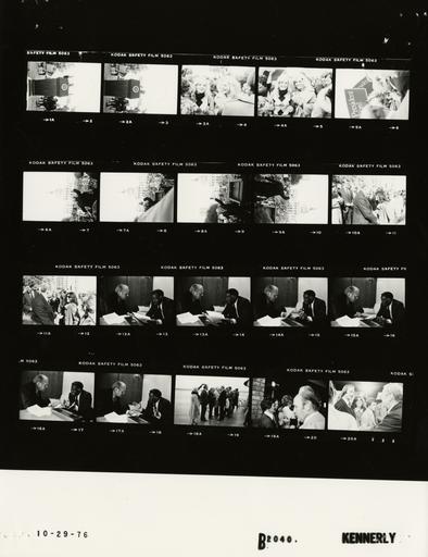 | Keywords: Ford B2040 NLGRF photo contact sheet (1976-10-29)(Gerald Ford Library).jpg White House Photographic Office WHPO is housed at the Gerald R Ford Presidential Library a branch of the National Archives and Records Administration NARA <br/><br/> This file is a 200 dpi photo contact sheet having images from roll of film B2040 of the August 9 1974 - January 20 1977 Gerald R Ford White House Photographic Office Series A0001-A9999 and B0001-B2886 photographs <br/><br/> The date on the photo contact sheet is the date the roll of film was processed not necessarily the date the photographs were taken See table below for additional details 1976-10-29 Gerald R Ford Presidential Library Image http //www fordlibrarymuseum gov/library/whphotos/B2040_NLGRF jpg B2040_NLGRF jpg from http //www fordlibrarymuseum gov/library/whphotos/19761029whpo pdf White House Photographs October 29 1976 of the http //www fordlibrarymuseum gov/Library/whphotos/whpo asp White House Photographic Collection page White House Photographic Office WHPO <br/> Creator David Hume Kennerly PD-USGov Institution Institution Gerald R Ford Presidential Library Table wikitable sortable + Photo contact sheet B2040 U S President Ford Administration Gerald R Ford Library Frame s Tone Subject proper Subject generic Names Geographic Location Photographer Date - 1A-2A BW Campaign Trip to Missouri; Rally in Front of the Old Court House - St Louis Missouri GRF at lectern speaking; taken from low vantage point; others in background GRF Others St Louis MO Gateway Mall - Luther Ely Smith Memorial Park Kennerly 1976-10-29 - 3A-4A BW Campaign Trip to Missouri; Rally in Front of the Old Court House - St Louis Missouri seated looking at camera laughing; twins Two Unidentified women St Louis MO Gateway Mall - Luther Ely Smith Memorial Park Kennerly 1976-10-29 - 5A BW Campaign Trip to Missouri; Rally in Front of the Old Court House - St Louis Missouri greeting handshaking; close up GRF Crowd St Louis MO Gateway Mall - Luther Ely Smith Memorial Park Kennerly 1976-10-29 - 6A-9A BW Campaign Trip to Missouri; Rally in Front of the Old Court House - St Louis Missouri GRF at lectern speaking waving making 360 degree turn; crowd and Old Court House in background GRF Platform Guests Crowd St Louis MO Gateway Mall - Luther Ely Smith Memorial Park Kennerly 1976-10-29 - 10A-11A BW Campaign Trip to Missouri; Following Rally in Front of the Old Court House - St Louis Missouri greeting handshaking standing talking GRF Crowd St Louis MO Gateway Mall - Luther Ely Smith Memorial Park Kennerly 1976-10-29 - 12A-17A BW Campaign Trip to Missouri; Prior to Departure for Houston Texas; President of California Baptist Convention -St Louis Missouri seated talking smiling GRF Maurice Dawkins St Louis MO Lambert Field - Air Force One Kennerly 1976-10-29 - 18A BW Campaign Trip to Texas - Arrival in Houston greeting handshaking; nose of Air Force One in background GRF Welcoming Committee Houston TX Hobby Field Kennerly 1976-10-29 - 19A-20A BW Campaign Trip to Texas - Arrival at Houston Marriott Hotel greeting handshaking; all may not be in frames GRF Charles Baker Jim Lopez Larry Weber Others Houston TX Houston Marriott Hotel Kennerly 1976-10-29 Gerald R Ford Presidential Library and Museum-cooperation PD-USGov Contact sheets by the Ford White House October 1976 Photographs by David Hume Kennerly from 1976 |