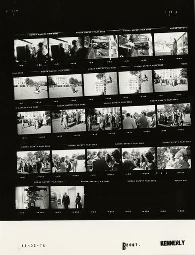 | Keywords: Ford B2067 NLGRF photo contact sheet (1976-11-02)(Gerald Ford Library).jpg White House Photographic Office WHPO is housed at the Gerald R Ford Presidential Library a branch of the National Archives and Records Administration NARA <br/><br/> This file is a 200 dpi photo contact sheet having images from roll of film B2067 of the August 9 1974 - January 20 1977 Gerald R Ford White House Photographic Office Series A0001-A9999 and B0001-B2886 photographs <br/><br/> The date on the photo contact sheet is the date the roll of film was processed not necessarily the date the photographs were taken See table below for additional details 1976-11-02 Gerald R Ford Presidential Library Image http //www fordlibrarymuseum gov/library/whphotos/B2067_NLGRF jpg B2067_NLGRF jpg from http //www fordlibrarymuseum gov/library/whphotos/19761102whpo pdf White House Photographs November 2 1976 of the http //www fordlibrarymuseum gov/Library/whphotos/whpo asp White House Photographic Collection page White House Photographic Office WHPO <br/> Creator David Hume Kennerly PD-USGov Institution Institution Gerald R Ford Presidential Library Table wikitable sortable + Photo contact sheet B2067 U S President Ford Administration Gerald R Ford Library Frame s Tone Subject proper Subject generic Names Geographic Location Photographer Date - 2A-3A BW Flight from Andrews Air Force Base to White House Following Last Campaign Trip seated talking; Nessen's back to camera Hartmann partially obscured by Nessen GRF Betty Ford Nessen Hartmann Marine One Kennerly 1976-11-02 - 4A-6A BW Arrival at White House Following Last Campaign Trip walking down steps from Marine One waving GRF Betty Ford South Lawn Kennerly 1976-11-02 - 7A-10A BW Arrival at White House Following Last Campaign Trip - Pet Golden Retriever GRF and BF walking arm-inarm; backs to camera; crowd and White House in background; dog not in every frame GRF Betty Ford Misty Crowd South Lawn Kennerly 1976-11-02 - 11A-14A BW Arrival at White House Following Last Campaign Trip greeting handshaking; crowd and White House in background GRF Betty Ford Cabinet Members Crowd South Lawn Kennerly 1976-11-02 - 15A BW Arrival at White House Following Last Campaign Trip embracing; crowd and White House in background GRF Simon; Crowd South Lawn Kennerly 1976-11-02 - 16A-21A BW Arrival at White House Following Last Campaign Trip greeting handshaking standing talking; various angles and distances; all not in every frame GRF Betty Ford Crowd South Lawn Kennerly 1976-11-02 - 22A BW Arrival at White House Following Last Campaign Trip standing talking; BF and Pullen arm-in-arm GRF Betty Ford Pullen Ground Floor -Diplomatic Reception Room Kennerly 1976-11-02 - 23A BW Arrival at White House Following Last Campaign Trip walking out of Diplomatic Reception Room GRF Ground Floor -Corridor Kennerly 1976-11-02 Gerald R Ford Presidential Library and Museum-cooperation PD-USGov Contact sheets by the Ford White House November 1976 Photographs by David Hume Kennerly from 1976 |