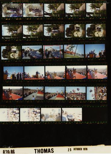 | Keywords: Ford B2086 NLGRF photo contact sheet (1976-10-24)(Gerald Ford Library).jpg White House Photographic Office WHPO is housed at the Gerald R Ford Presidential Library a branch of the National Archives and Records Administration NARA <br/><br/> This file is a 200 dpi photo contact sheet having images from roll of film B2086 of the August 9 1974 - January 20 1977 Gerald R Ford White House Photographic Office Series A0001-A9999 and B0001-B2886 photographs <br/><br/> The date on the photo contact sheet is the date the roll of film was processed not necessarily the date the photographs were taken See table below for additional details 1976-10-24 Gerald R Ford Presidential Library Image http //www fordlibrarymuseum gov/library/whphotos/B2086_NLGRF jpg B2086_NLGRF jpg from http //www fordlibrarymuseum gov/library/whphotos/19761024whpo pdf White House Photographs October 24 1976 of the http //www fordlibrarymuseum gov/Library/whphotos/whpo asp White House Photographic Collection page White House Photographic Office WHPO - Thomas PD-USGov Institution Institution Gerald R Ford Presidential Library Table wikitable sortable + Photo contact sheet B2086 U S President Ford Administration Gerald R Ford Library Frame s Tone Subject proper Subject generic Names Geographic Location Photographer Date - 2-3 Color Campaign Trip to California; Sunday Mass at San Gabriel Mission Church -San Gabriel California standing in doorway from church; in garden GRF San Gabriel CA San Gabriel Mission Church Thomas 1976-10-24 - 4-12 Color Campaign Trip to California; Following Sunday Mass at San Gabriel Mission Church - San Gabriel California walking talking in garden; various angles and distances; large cruciifx in background in some frames; all not in every frame GRF Father Leo Mattecheck Father Bernard O'Connor San Gabriel CA San Gabriel Mission Church Thomas 1976-10-24 - 13-14 Color Campaign Trip to California; Following Sunday Mass at San Gabriel Mission Church - San Gabriel California GRF standing in open limousine waving; crowd on curb; mission in background GRF Crowd San Gabriel CA San Gabriel Mission Church - Outside Thomas 1976-10-24 - 15 Color Campaign Trip to California; Campaign Rally in Fountain Valley - Fountain Valley California fire engine Fountain Valley CA Fountain Valley Recreation Center Thomas 1976-10-24 - 16-28 Color Campaign Trip to California; Campaign Rally in Fountain Valley - Fountain Valley California GRF at lectern waving speaking; various angles and distances; all not in every frame; hot ait balloons in background in some frames GRF Don Sutton Steve Garvey Glenn Ford Rep Wiggins Platform Guests Fountain Valley CA Fountain Valley Recreation Center Thomas 1976-10-24 - 29-30 Color Campaign Trip to California; Campaign Rally in Fountain Valley - Fountain Valley California greeting handshaking; all not in both frames GRF Crowd Fountain Valley CA Fountain Valley Recreation Center Thomas 1976-10-24 Gerald R Ford Presidential Library and Museum-cooperation PD-USGov Contact sheets by the Ford White House October 1976 |