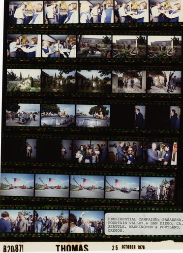 | Keywords: Ford B2087 NLGRF photo contact sheet (1976-10-24)(Gerald Ford Library).jpg White House Photographic Office WHPO is housed at the Gerald R Ford Presidential Library a branch of the National Archives and Records Administration NARA <br/><br/> This file is a 200 dpi photo contact sheet having images from roll of film B2087 of the August 9 1974 - January 20 1977 Gerald R Ford White House Photographic Office Series A0001-A9999 and B0001-B2886 photographs <br/><br/> The date on the photo contact sheet is the date the roll of film was processed not necessarily the date the photographs were taken See table below for additional details 1976-10-24 Gerald R Ford Presidential Library Image http //www fordlibrarymuseum gov/library/whphotos/B2087_NLGRF jpg B2087_NLGRF jpg from http //www fordlibrarymuseum gov/library/whphotos/19761024whpo pdf White House Photographs October 24 1976 of the http //www fordlibrarymuseum gov/Library/whphotos/whpo asp White House Photographic Collection page White House Photographic Office WHPO - Thomas PD-USGov Institution Institution Gerald R Ford Presidential Library Table wikitable sortable + Photo contact sheet B2087 U S President Ford Administration Gerald R Ford Library Frame s Tone Subject proper Subject generic Names Geographic Location Photographer Date - 3A-9A Color Campaign Trip to California women holding birthday cake man blowing out candles in 5th and 6th frames Three Unidentified Flight Attendants; Unidentified Man Press Plane - Galley Thomas 1976-10-24 - 10A-15A Color Campaign Trip to California; Following Sunday Mass at San Gabriel Mission Church - San Gabriel California walking talking in garden; various angles and distances; all not in every frame GRF Father Leo Mattecheck Father Bernard O'Connor San Gabriel CA San Gabriel Mission Church Thomas 1976-10-24 - 16A-17A Color Campaign Trip to California; Prior to Departure From San Gabriel Mission Church - San Gabriel California GRF walking out gate waving GRF Others San Gabriel CA San Gabriel Mission Church - Outside Thomas 1976-10-24 - 18A-20A Color Campaign Trip to California; Following Sunday Mass at San Gabriel Mission Church - San Gabriel California GRF standing in open limousine waving; crowd on curb; mission in background GRF Crowd San Gabriel CA San Gabriel Mission Church - Outside Thomas 1976-10-24 - 21A-26A Color Campaign Trip to California - Prior to Reception for California State PFC Staff and Volunteers standing posing; flash misfunction in 1st 4 frames GRF Unidentified Family Pasadena CA Huntington-Sheraton Inn - Porteous Cottage Thomas 1976-10-24 - 27A Color Campaign Trip to California - Prior to Reception for California State PFC Staff and Volunteers greeting handshaking near elevator GRF Pasadena Police Officer Pasadena CA Huntington-Sheraton Inn - Porteous Cottage Thomas 1976-10-24 - 28A-31A Color Campaign Trip to California; Arrival for Campaign Rally in Fountain Valley -Fountain Valley California GRF standing waving in limousine; going under large flag suspended between two fire engines GRF Secret Service Firemen Others Fountain Valley CA Street Thomas 1976-10-24 - 32A-35A Color Campaign Trip to California; Campaign Rally in Fountain Valley; Actor - Fountain Valley California walking greeting handshaking talking; rall not in every frame GRF John Wayne; Crowd Fountain Valley CA Fountain Valley Recreation Center Thomas 1976-10-24 Gerald R Ford Presidential Library and Museum-cooperation PD-USGov Contact sheets by the Ford White House October 1976 |