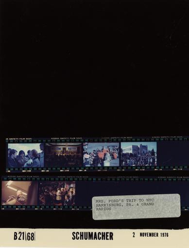 | Keywords: Ford B2168 NLGRF photo contact sheet (1976-11-01)(Gerald Ford Library).jpg White House Photographic Office WHPO is housed at the Gerald R Ford Presidential Library a branch of the National Archives and Records Administration NARA <br/><br/> This file is a 200 dpi photo contact sheet having images from roll of film B2168 of the August 9 1974 - January 20 1977 Gerald R Ford White House Photographic Office Series A0001-A9999 and B0001-B2886 photographs <br/><br/> The date on the photo contact sheet is the date the roll of film was processed not necessarily the date the photographs were taken See table below for additional details 1976-11-01 Gerald R Ford Presidential Library Image http //www fordlibrarymuseum gov/library/whphotos/B2168_NLGRF jpg B2168_NLGRF jpg from http //www fordlibrarymuseum gov/library/whphotos/19761101whpo pdf White House Photographs November 1 1976 of the http //www fordlibrarymuseum gov/Library/whphotos/whpo asp White House Photographic Collection page White House Photographic Office WHPO - Schumacher PD-USGov Institution Institution Gerald R Ford Presidential Library Table wikitable sortable + Photo contact sheet B2168 U S President Ford Administration Gerald R Ford Library Frame s Tone Subject proper Subject generic Names Geographic Location Photographer Date - 1A Color Betty Ford Campaign Trip to Pennsylvania - Arrival in Harrisburg PA greeting talking; BF holding bouquet of roses; close up Betty Ford Others Harrisburg PA Harrisburg Capitol City Airport Schumacher 1976-11-01 - 2A Color Betty Ford Campaign Trip to Pennsylvania - Rotary Club Luncheon BF at lectern speaking; crowd in foreground; long shot from back of room Betty Ford Rotary Club Members Crowd Harrisburg PA Holiday Inn-Town Schumacher 1976-11-01 - 3A Color Betty Ford Campaign Trip to Pennsylvania - PFC Rally Prior to Departure for Michigan standing by rope; several in crowd holding signs for GRF Secret Service; Crowd Harrisburg PA Harrisburg Capitol City Airport Schumacher 1976-11-01 - 4A Color Betty Ford Campaign Trip to Pennsylvania - PFC Rally Prior to Departure for Michigan BF Connors and others on platform; crowd in foregrounds; terminal in background; long shots Betty Ford Chuck Connors Crowd Harrisburg PA Harrisburg Capitol City Airport Schumacher 1976-11-01 - 5A Color Schumacher 1976-11-01 - 6A Color Campaign Trip to Michigan - Rally in Front of the Pantlind Hotel at lectern talking; taken from lower vantage; night shot GRF Grand Rapids MI Pantlind Hotel -Outside Schumacher 1976-11-01 - 7A Color Campaign Trip to Michigan - Rally in Front of the Pantlind Hotel GRat lectern speaking; others standing behind; crowd on right of framenight shot GRF Betty Ford Sen Griffin Gov Milliken Others; Crowd Grand Rapids MI Pantlind Hotel -Outside Schumacher 1976-11-01 Gerald R Ford Presidential Library and Museum-cooperation PD-USGov Contact sheets by the Ford White House November 1976 |