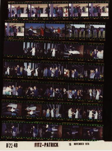Keywords: Ford B2248 NLGRF photo contact sheet (1976-11-10)(Gerald Ford Library).jpg White House Photographic Office WHPO is housed at the Gerald R Ford Presidential Library a branch of the National Archives and Records Administration NARA <br/><br/> This file is a 200 dpi photo contact sheet having images from roll of film B2248 of the August 9 1974 - January 20 1977 Gerald R Ford White House Photographic Office Series A0001-A9999 and B0001-B2886 photographs <br/><br/> The date on the photo contact sheet is the date the roll of film was processed not necessarily the date the photographs were taken See table below for additional details 1976-11-10 Gerald R Ford Presidential Library Image http //www fordlibrarymuseum gov/library/whphotos/B2248_NLGRF jpg B2248_NLGRF jpg from http //www fordlibrarymuseum gov/library/whphotos/19761110whpo pdf White House Photographs November 10 1976 of the http //www fordlibrarymuseum gov/Library/whphotos/whpo asp White House Photographic Collection page White House Photographic Office WHPO - Fitz-Patrick PD-USGov Institution Institution Gerald R Ford Presidential Library Table wikitable sortable + Photo contact sheet B2248 U S President Ford Administration Gerald R Ford Library Frame s Tone Subject proper Subject generic Names Geographic Location Photographer Date - 17-18 Color Vacation Trip to Palm Springs California -Party at Home of Fred Wilson GRF and woman dancing in foreground; others in background; all not in both frames GRF Unidentified Woman; Others Palm Springs CA Fred Wilson Residence - Large Tent Fitz-Patrick 1976-11-10 - 19 Color Vacation Trip to Palm Springs California - Party at Home of Fred Wilson performing Nessen playing tambourine Nessen Unidentified Singer Palm Springs CA Fred Wilson Residence - Large Tent Fitz-Patrick 1976-11-10 - 20 Color Vacation Trip to Palm Springs California - Party at Home of Fred Wilson GRF and man greeting handshaking; others in background GRF Unidentified Man; Others Palm Springs CA Fred Wilson Residence - Large Tent Fitz-Patrick 1976-11-10 - 21-22 Color Vacation Trip to Palm Springs California -Party at Home of Fred Wilson GRF and woman dancing in foreground; others in background; all not in both frames GRF Unidentified Woman; Others Palm Springs CA Fred Wilson Residence - Large Tent Fitz-Patrick 1976-11-10 - 23 Color Vacation Trip to Palm Springs California - Party at Home of Fred Wilson BF and man dancing in foreground; others in background; all not in both frames Betty Ford Unidentified Man; Others Palm Springs CA Fred Wilson Residence - Large Tent Fitz-Patrick 1976-11-10 - 24-25 Color Vacation Trip to Palm Springs California - Party at Home of Fred Wilson GRF and woman dancing in foreground; others in background; all not in both frames GRF Unidentified Woman; Others Palm Springs CA Fred Wilson Residence - Large Tent Fitz-Patrick 1976-11-10 - 26 Color Vacation Trip to Palm Springs California - Party at Home of Fred Wilson Hope and woman dancing in foreground; GRF on far left; others in background GRF Unidentified Woman; Bob Hope Unidentified Woman Others Palm Springs CA Fred Wilson Residence - Large Tent Fitz-Patrick 1976-11-10 - 27-29 Color Vacation Trip to Palm Springs California -Party at Home of Fred Wilson BF and boy dancing in foreground; others in background watching Betty Ford Young Boy Others Palm Springs CA Fred Wilson Residence - Large Tent Fitz-Patrick 1976-11-10 - 30 Color Vacation Trip to Palm Springs California -Party at Home of Fred Wilson on stage; man raising BF's arm over her head symbolizing the winner Betty Ford Unidentified Man Palm Springs CA Fred Wilson Residence - Large Tent Fitz-Patrick 1976-11-10 - 31-32 Color Vacation Trip to Palm Springs California -Party at Home of Fred Wilson BF and man dancing in foreground; others in background; all not in both frames Betty Ford Unidentified Man Palm Springs CA Fred Wilson Residence - Large Tent Fitz-Patrick 1976-11-10 - 33-37 Color Vacation Trip to Palm Springs California - Party at Home of Fred Wilson dancing a fast dance Bob Hope Palm Springs CA Fred Wilson Residence - Large Tent Fitz-Patrick 1976-11-10 - 3-4 Color Vacation Trip to Palm Springs California -Golf Outing at Thunderbird Country Club posing arm-in-arm laughing; at curb near entrance GRF Unidentified Doorman Palm Springs CA Thunderbird Country Club Fitz-Patrick 1976-11-10 - 5 Color Vacation Trip to Palm Springs California -Golf Outing at Thunderbird Country Club standing talking; at curb near entrance GRF Unidentified Doorman Unidentified Man Palm Springs CA Thunderbird Country Club Fitz-Patrick 1976-11-10 - 6-8 Color Vacation Trip to Palm Springs California -Golf Outing at Thunderbird Country Club standing posing; at curb near entrance GRF Unidentified Man Palm Springs CA Thunderbird Country Club Fitz-Patrick 1976-11-10 - 9-10 Color Vacation Trip to Palm Springs California -Golf Outing at Thunderbird Country Club standing talking near clubhouse not shown GRF Three Unidentified Golfers Palm Springs CA Thunderbird Country Club Fitz-Patrick 1976-11-10 - 11-12 Color Vacation Trip to Palm Springs California - Golf Outing at Thunderbird Country Club standing talking near tee box GRF Four Unidentified Golfers Palm Springs CA Thunderbird Country Club Fitz-Patrick 1976-11-10 - 13 Color Fitz-Patrick 1976-11-10 - 14-16 Color Vacation Trip to Palm Springs California -Party at Home of Fred Wilson performing; various angles and distances; all not in every frame Unidentifed Singer Small Orchestra Palm Springs CA Fred Wilson Residence - Large Tent Fitz-Patrick 1976-11-10 Gerald R Ford Presidential Library and Museum-cooperation PD-USGov Contact sheets by the Ford White House November 1976 |