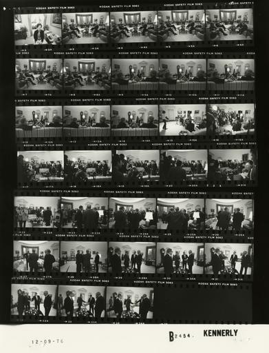 | Keywords: Ford B2454 NLGRF photo contact sheet (1976-12-09)(Gerald Ford Library).jpg White House Photographic Office WHPO is housed at the Gerald R Ford Presidential Library a branch of the National Archives and Records Administration NARA <br/><br/> This file is a 200 dpi photo contact sheet having images from roll of film B2454 of the August 9 1974 - January 20 1977 Gerald R Ford White House Photographic Office Series A0001-A9999 and B0001-B2886 photographs <br/><br/> The date on the photo contact sheet is the date the roll of film was processed not necessarily the date the photographs were taken See table below for additional details 1976-12-09 Gerald R Ford Presidential Library Image http //www fordlibrarymuseum gov/library/whphotos/B2454_NLGRF jpg B2454_NLGRF jpg from http //www fordlibrarymuseum gov/library/whphotos/19761209whpo pdf White House Photographs December 9 1976 of the http //www fordlibrarymuseum gov/Library/whphotos/whpo asp White House Photographic Collection page White House Photographic Office WHPO <br/> Creator David Hume Kennerly PD-USGov Institution Institution Gerald R Ford Presidential Library Table wikitable sortable + Photo contact sheet B2454 U S President Ford Administration Gerald R Ford Library Frame s Tone Subject proper Subject generic Names Geographic Location Photographer Date - 2 BW sitting at desk; silly exasperated expression Yates Scheduling and Advance Office Kennerly 1976-12-09 - 3-8 BW Unidentified Meeting seated around fireplace talking; wide angle shots taken from fireplace toward desk GRF Rockefeller Ronald Reagan John Connally Oval Office Kennerly 1976-12-09 - 9-14 BW Unidentified Meeting seated around fireplace talking; NAR and Connally in foreground backs to camera GRF Rockefeller Ronald Reagan John Connally Oval Office Kennerly 1976-12-09 - 15-16 BW Unidentified Meeting seated around fireplace talking; media entering office GRF Rockefeller Ronald Reagan John Connally; Media Oval Office Kennerly 1976-12-09 - 17-22 BW Unidentified Meeting GRF NAR RR and JC standing backs to fireplace; media circled around; all media not in every frame GRF Rockefeller Ronald Reagan John Connally; Media Oval Office Kennerly 1976-12-09 - 23-26 BW Unidentified Meeting GRF NAR RR and JC standing backs to fireplace; media moving toward door; taken from fireplace toward desk GRF Rockefeller Ronald Reagan John Connally; Media Oval Office Kennerly 1976-12-09 - 27-31 BW Unidentified Meeting standing talking; various angles and distances GRF Rockefeller Ronald Reagan John Connally Oval Office Kennerly 1976-12-09 - 32-34 BW Unidentified Meeting standing talking handshaking saying goodbye; taken from fireplace toward desk GRF Rockefeller Ronald Reagan John Connally Oval Office Kennerly 1976-12-09 Gerald R Ford Presidential Library and Museum-cooperation PD-USGov Contact sheets by the Ford White House December 1976 Photographs by David Hume Kennerly from 1976 |