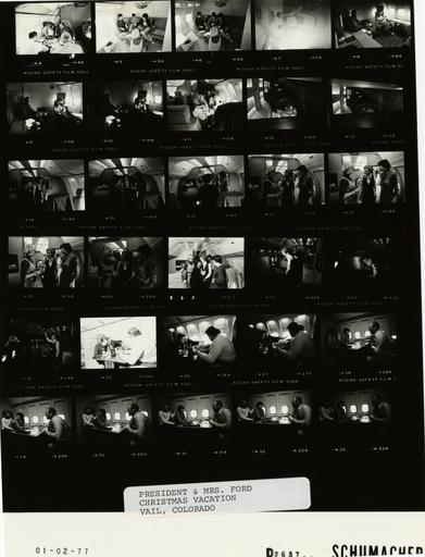 | Keywords: Ford B2637 NLGRF photo contact sheet (1977-01-02)(Gerald Ford Library).jpg White House Photographic Office WHPO is housed at the Gerald R Ford Presidential Library a branch of the National Archives and Records Administration NARA <br/><br/> This file is a 200 dpi photo contact sheet having images from roll of film B2637 of the August 9 1974 - January 20 1977 Gerald R Ford White House Photographic Office Series A0001-A9999 and B0001-B2886 photographs <br/><br/> The date on the photo contact sheet is the date the roll of film was processed not necessarily the date the photographs were taken See table below for additional details 1977-01-02 Gerald R Ford Presidential Library Image http //www fordlibrarymuseum gov/library/whphotos/B2637_NLGRF jpg B2637_NLGRF jpg from http //www fordlibrarymuseum gov/library/whphotos/19770102whpo pdf White House Photographs January 2 1977 of the http //www fordlibrarymuseum gov/Library/whphotos/whpo asp White House Photographic Collection page White House Photographic Office WHPO - Schumacher PD-USGov Institution Institution Gerald R Ford Presidential Library Table wikitable sortable + Photo contact sheet B2637 U S President Ford Administration Gerald R Ford Library Frame s Tone Subject proper Subject generic Names Geographic Location Photographer Date - 4 BW Trip to Colorado - Return Flight from Grand Junction CO to Andrews Air Force Base MD seated at table; documents on table; Barrett's back to camera; Scowcroft talking to woman who is peeking between seats Cavanaugh Raoul-Duval Scowcroft Barret; Unidentified Woman Barbara Rippie Air Force One Schumacher 1977-01-02 - 5-7 BW Trip to Colorado - Return Flight from Grand Junction CO to Andrews Air Force Base MD three \wwomen seated on sofa Susan kneeling on floor back to camera smoking cigarette Nancy Chirdon Weidenfeld Unidentified Woman Susan Ford Air Force One - President's Cabin Schumacher 1977-01-02 - 8-10 BW Trip to Colorado - Return Flight from Grand Junction CO to Andrews Air Force Base MD seated talking Sen Mrs John Glenn Air Force One Schumacher 1977-01-02 - 11 BW Trip to Colorado - Return Flight from Grand Junction CO to Andrews Air Force Base MD seated at table; Barrett reading Cavanaugh on telephone Raoul-Duval in foreground back to camera Barrett Cavanaugh Raoul-Duval Air Force One Schumacher 1977-01-02 - 12-13 BW Trip to Colorado - Return Flight from Grand Junction CO to Andrews Air Force Base MD looking down aisle od main passenger cabin; Gramshammer seated in foreground others seated farther back Sheika Gramshammer Others Air Force One Schumacher 1977-01-02 - 14-21 BW Trip to Colorado - Return Flight from Grand Junction CO to Andrews Air Force Base MD stansding in aisle laughing talking; various angles and distances; all not in every frame Betty Ford Nancy Chirdon Sheika Gramshammer Susan Ford Weidenfeld Air Force One Schumacher 1977-01-02 - 22-24 BW Trip to Colorado - Return Flight from Grand Junction CO to Andrews Air Force Base MD BF standing in aisle talking to Frances Lewine not seen in frame; Growald seated across from Lewine Betty Ford Dick Growald Others Air Force One Schumacher 1977-01-02 - 25-27 BW Trip to Colorado - Return Flight from Grand Junction CO to Andrews Air Force Base MD seated at table working; tape recorders on table Phil Jones Frances Lewine Dick Growald Air Force One Schumacher 1977-01-02 - 28-33 BW Trip to Colorado - Return Flight from Grand Junction CO to Andrews Air Force Base MD seated talking laughing; various distances GRF Kira Gramshammer Sheika Gramshammer Air Force One Schumacher 1977-01-02 Gerald R Ford Presidential Library and Museum-cooperation PD-USGov Contact sheets by the Ford White House January 1977 |