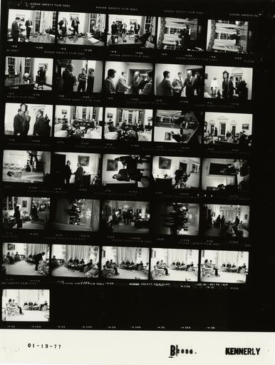 | Keywords: Ford B2856 NLGRF photo contact sheet (1977-01-19)(Gerald Ford Library).jpg White House Photographic Office WHPO is housed at the Gerald R Ford Presidential Library a branch of the National Archives and Records Administration NARA <br/><br/> This file is a 200 dpi photo contact sheet having images from roll of film B2856 of the August 9 1974 - January 20 1977 Gerald R Ford White House Photographic Office Series A0001-A9999 and B0001-B2886 photographs <br/><br/> The date on the photo contact sheet is the date the roll of film was processed not necessarily the date the photographs were taken See table below for additional details 1977-01-19 Gerald R Ford Presidential Library Image http //www fordlibrarymuseum gov/library/whphotos/B2856_NLGRF jpg B2856_NLGRF jpg from http //www fordlibrarymuseum gov/library/whphotos/19770119whpo pdf White House Photographs January 19 1977 of the http //www fordlibrarymuseum gov/Library/whphotos/whpo asp White House Photographic Collection page White House Photographic Office WHPO <br/> Creator David Hume Kennerly PD-USGov Institution Institution Gerald R Ford Presidential Library Table wikitable sortable + Photo contact sheet B2856 U S President Ford Administration Gerald R Ford Library Frame s Tone Subject proper Subject generic Names Geographic Location Photographer Date - 2-4 BW GRF seated at desk; others moving around office; all not in every frame GRF Marsh Cavanaugh Scowcroft Unidentified Man Oval Office Kennerly 1977-01-19 - 5 BW GRF seated at desk; BS standing nearby back to camera GRF Scowcroft Oval Office Kennerly 1977-01-19 - 6-7 BW walking away from desk; desk bare except for phone and glass of water GRF Oval Office Kennerly 1977-01-19 - 8 BW standing talking GRF Marsh Unidentified Man Marsh's son White House Hallway Kennerly 1977-01-19 - 9-10 BW greeting handshaking standing talking GRF Three Unidentified Men White House Hallway Kennerly 1977-01-19 - 11-12 BW greeting handshaking standing talking GRF Army Major General Unidentified Man Oval Office Kennerly 1977-01-19 - 13-14 BW seated talking near fireplace; desk in background GRF Army Major General Unidentified Man Oval Office Kennerly 1977-01-19 - 15-16 BW taking seats in 1st frame; seated around desk talking GRF Barrett Oval Office Kennerly 1977-01-19 - 17 BW BF standing in foreground wearing housecoat robe ; GRF seated in background smoking pipe; fett up on coffee table GRF Betty Ford Second Floor - West Sitting Room Kennerly 1977-01-19 - 18-19 BW Prior to Dinner with Vice President Rockefeller's Family greeting handshaking talking; Happy not in 1st frame GRF Rockefeller Happy Rockefeller Second Floor - Center Hall Kennerly 1977-01-19 - 20 BW Prior to Dinner with Vice President Rockefeller's Family - Sons of VP Rockefeller greeting handshaking GRF Mark David Rockefeller Second Floor - Center Hall Kennerly 1977-01-19 - 21 BW Prior to Dinner with Vice President Rockefeller's Family - Sons of VP Rockefeller - Prior to Boys Staying Overnight/Sleepover in Lincoln Bedroom GRF walking away; boys picking up suitcases board games GRF Mark David Rockefeller Second Floor - Center Hall Kennerly 1977-01-19 - 22-23 BW Prior to Dinner with Vice President Rockefeller's Family - Sons of VP Rockefeller - Prior to Boys Staying Overnight/Sleepover in Lincoln Bedroom walking away; boys carying suitcases board games; backs to camera Mark David Rockefeller Second Floor - Center Hall Kennerly 1977-01-19 - 24-26 BW Prior to Dinner with Vice President Rockefeller's Family - Sons of VP Rockefeller - Prior to Boys Staying Overnight/Sleepover in Lincoln Bedroom walking toward camera talking GRF Mark David Rockefeller Second Floor - Center Hall Kennerly 1977-01-19 - 27-32 BW Prior to Dinner with Vice President Rockefeller's Family - Sons of VP Rockefeller - Prior to Boys Staying Overnight/Sleepover in Lincoln Bedroom entering room in 1st frame; seated talking in remmaininf frames; all not in every frame GRF Betty Ford Rockefeller Happy Rockefeller Mark David Rockefeller Second Floor - West Sitting Room Kennerly 1977-01-19 Gerald R Ford Presidential Library and Museum-cooperation PD-USGov Contact sheets by the Ford White House January 1977 Photographs by David Hume Kennerly from 1977 |