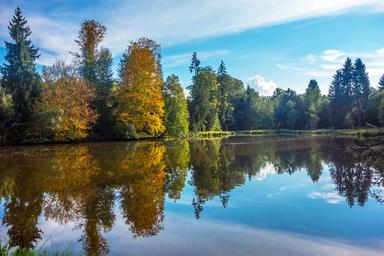 Keywords: forest autumn golden lake pond light nature autumn forest sun trees yellow mirroring shadow sky leaves larch