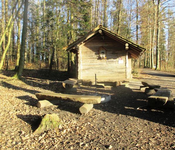 Keywords: forest forest house trees firs mood idyllic magic forest atmospheric barbecue area cozy mystical romance