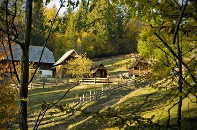 Keywords: forest house landscape nature tree fence wooden trees foliage greenery sunlight