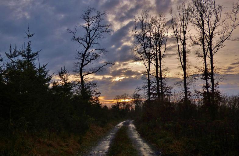 Keywords: forest path nature trees sunset december luxembourg landscape evening
