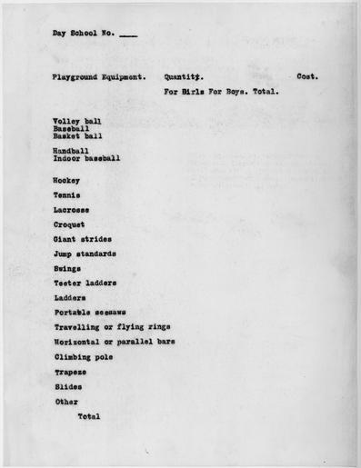 | Keywords: Form for school playground equipment - NARA - 284894.tif Scope and content General notes 284894 Local identifier Department of the Interior Office of Indian Affairs Pine Ridge Agency 1878 - 09/17/1947 NARA's Central Plains Region Kansas City NREA 400 West Pershing Road Kansas City MO 64108 other date circa 1916 1916 Record group Record Group 75 Records of the Bureau of Indian Affairs 1793 - 1999 Record group ARC 404 Correspondence of the Day School Inspector J J Duncan compiled 02/09/1910 - 09/06/1916 Series ARC 283922 File unit Correspondence of Day School Inspector J J Duncan Jan 19 1916-Sept 6 1916 01/19/1916 - 09/06/1916 File unit ARC 284892 Variant control numbers NAIL Control Number NRE-75-169-K-2 yes Other versions NARA-cooperation PD-USGov Documents related to Pine Ridge Indian Reservation |