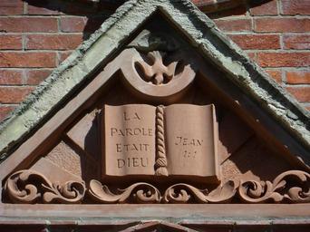 Keywords: Former French Protestant Church, Queensbury Mews, Brighton (April 2015) (Inscribed Pediment).JPG Inscribed pediment at the former French Protestant Reformed Church L'Église Protéstante Française Queensbury Mews Brighton City of Brighton and Hove England Dating from 1887 this was one of only two French Reformed churches in Britain It eventually closed with effect from 26 July 2008 and it is now a house On Brighton Hove City Council's Local List of Heritage Assets Own 2015-04-05 Hassocks5489 French Protestant Church Brighton Cc-zero |