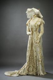 Keywords: Förmiddagsklänning, drottning Victoria - Livrustkammaren - 15799.tif Morning dress that belonged to Victoria of Baden Hellång höghalsad klänning med smalt liv och kjoldel med släp Klänningen är av vit crépe de chine och med axelpartiet draperat med vit taft tyll och spets Delvis dold knäppning 750 mm lång mitt bak från kragens övre kant och 325 mm nedanför midjan Den nedre delen av knäppningen är dubbel dvs med en inre knapprad för knäppning av fodret och en yttre knapprad Den inre knappraden består av sex tryckknappar Den överliggande knäppningen består av tre tryckknappar Livet knäpps från midjan med hakar och hyskor placerade varannan Ovanpå denna knäppning knäpps livet med ytterligare en knäppning sittande på en påsydd slå med sex små hakar till vänster om sprundet och fem vita silkesstygn som hyskor till höger om sprundet Elva hakar och hyskor på vardera sida av sprundet Från axlarna och upp till kragen består knäppningen av mindre hakar och hyskor 14 hakar till vänster om sprundet och 18 hyskor av vita silkesstygn till höger om sprundet Knäppningen går upp till övre kragkanten Kragen är 65 mm hög av en vit spets med en dekor av blommor Spetsen är i övre kanten omvikt Kragen går på framstycket ned som i en spetsig flik Den höga halsen är av vitt siden överklädd med tyll Nedanför halsen en djup rundad ringning med vit spets i kanten 30 mm Livstycket har en dekor av broderade blommor och blad av guldtråd och av vit silkestråd Klänningen dekoreras av två band 40 mm breda av broderade guldlöv i dess mitt tre ränder av guldtråd och vågiga kanter ifyllda med guldtråd Banden går tvärs över klänningen från framstyckets nedre kant till bakstyckets nedre kant Banden är upptill av vitt siden med broderi påsydda på klänningen men broderiet övergår till att broderas direkt på själva kjoldelen Banden är upptill från bröstet till skuldrorna något bredare och uppslitsat i kanterna Vid midjan mitt bak sitter två stora knappar klädda med guldtyg och med en dekor av guldsnöre samt en broderad blomma mitt på Två sidosprund 980 mm höga och som bredast 760 mm I sprunden ses ett undertyg av guldtyg överdraget med tyll och med spets med uppåtsträvande blomsterrankor På sidorna en spets med blomsterstänglar rundlar och girlanger Kantspetsarna sitter lösa vid den inre kanten Samma spets har sytts i sprundens nederkanter Mitt fram är klänningens yttertyg helt öppet Kanterna har löst sytts fast med fem stygn vid ett underliggande guldtyg som draperats med tyll och spets med en dekor av uppåtsträvande blomsterrankor med en rundel med en ros i dess mitt På sidorna har sytts på samma spets som den som kantar sprunden Samma dekor i nederkanten mitt fram Kantspetsarna sitter lösa vid inre kanten Kjolen har i nederkanten en 69 mm bred fåll På insidan är i nederkanten på fodret påsytt en bred volang av tunt vitt linne lagt i smala stråveck och i nedre kanten ett dubbelt lager av vit knypplad spets 100 mm bred Långa smala ärmar av vit crep överdragna med tyll och med sex horisontella band av vit spets med ett blommönster Vid ärmsluten en 25 mm bred spets Ärmarna har nedtill ett 100 mm högt sprund kantat av tre små klädda knappar Vid axlarna har sytts två rader av spets som två volanger överlappandes varandra något smalare framtill än bak På insidan är klänningen fodrad med vit taft För att ge livet stadga har på insidan försetts med skenor av valbard fem skenor fram och sex skenor bak 15 mm breda Guldtyget är styvt och ger kjolen volym Mitt fram på insidan av livet sitter ett påsytt vitt sidenband 35 mm brett På bandet står firmamärket invävt med gul silkestråd Mme Anna Gröber//Robes et Confections//Kärntnerstrasse 10 in der Passage Wien Bandet är för att knäppas runt midjan och hänger på sidorna fritt med en förgylld hyska respektive en hake i ändarna På insidan av spetskragen sitter sju smala sidenband 60 mm breda av ljusrosa siden Ärmhålorna har stärkts med en tygbit med spetskanter Stadkanter av vita sidenband 35 mm breda original caption Förmiddagsklänning drottning Victoria LRK 19140 Fler inventarienr <br/> Nyckelord Klänning Parasoll Vit Föremålsbild Kläder 1910-tal Sekelskifte Drottning Victoria 1911 taffeta Färg vit material taft - tulle Färg vit material tyll - lace Färg vit material spets - gold thread Färg guld material guldtråd size mm 2200 bak size mm 750 bröst LRK Victoria av Sverige Minnesutställning över Konung Gustaf V 1951-1952 Drottningar - kvinnlighet och makt 1999 Fest och fritid vid hovet 2003 M me Anna Gröber Robes et confections 1 Kärntnerstrasse 10 in der Passage Wien Anna Gröber M me Anna Gröber Robes et confections 1 Kärntnerstrasse 10 in der Passage Wien Anna Gröber place of origin original filename lm_dig2591 55659 inventory number LRK 19140 15799 CC-BY-SA Göran Schmidt <gallery caption Different images of same object > File Förmiddagsklänning drottning Victoria - Livrustkammaren - 50042 tif File Förmiddagsklänning drottning Victoria - Livrustkammaren - 41483 tif File Förmiddagsklänning drottning Victoria - Livrustkammaren - 58603 tif </gallery> Göran Schmidt White clothing 1910s fashion Media contributed by LSH unmatched material Media contributed by LSH dim-with multiple size templates Media contributed by LSH unmatched creator Media contributed by LSH unmatched keyword Color images from Livrustkammaren 20th century clothing in Livrustkammaren Crepes fabric Media contributed by LSH 2013-10 wikipedia sv Victoria av Baden |