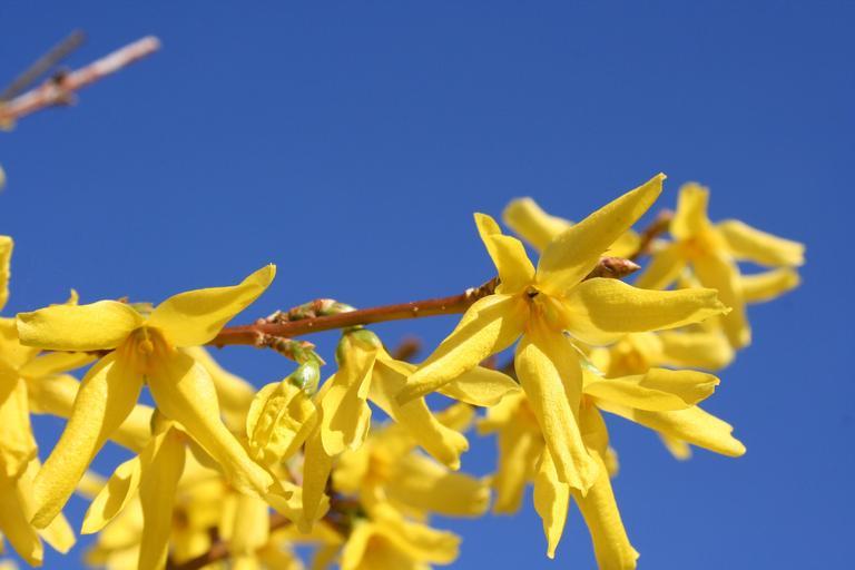 Keywords: forsythia gold lilac golden bells ornamental shrub blossom bloom plant spring yellow bloom nature flowers flower close blue