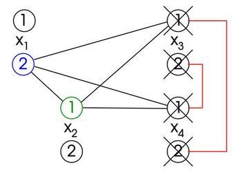 Keywords: Forward-arc-2.svg An example showing that forward checking is different than arc-concistency look ahead This is what full and in this case also partial look ahead does variables are considered in pairs so that x3 and x4 cannot be possibly be both assigned a consistent value because of the constraint between them Constraint satisfaction 2006-02-06 own assumed Tizio |