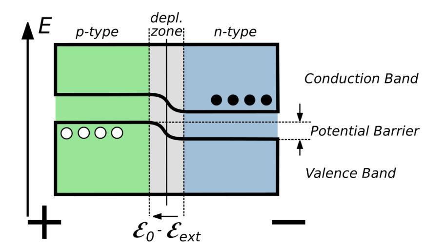 Keywords: Forward-Biased pn Junction Bands.svg Diagram of a pn junction under forward bias showing conduction and valence bands the depletion zone the potential barrier the resultant electric field <math>\mathcal E _0-\mathcal E _ ext </math> and the types of semiconductor Own drawing done in Inkscape 2007-02-20 inductiveload Un-Biased pn Junction Reverse Biased pn Junction PN-junction band diagrams |