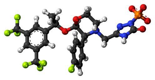 Keywords: Fosaprepitant-anion-3D-balls.png Ball-and-stick model of the fosaprepitant molecule an antiemetic drug This image shows the anionic negatively charged form Colour code 505050 Carbon C black<br> F0F0F0 Hydrogen H white<br> F51E1E Oxygen O red<br> 3C50FA Nitrogen N blue<br> C8FA00 Yellow-green Fluorine F<br> FA8C00 Phosphorus P orange<br> 2011-06-13 own DS Visualizer Jynto talk Neutral form ball-and-stick version Neutral form space-filling version Anionic form space-filling version cc-zero Fosaprepitant Ball-and-stick models Images by Jynto |