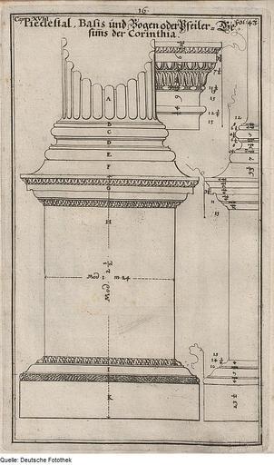 Keywords: Fotothek df tg 0001632 Architektur ^ Bauwesen ^ Säule ^ Bogen ^ korinthische Ordnung.jpg Scan Deutsche Fotothek df_tg_0001632 color 2007 MIK-Center Berlin GmbH 88961632 Kap 17 Fig 16 Bl 43 Nürnberg Piedestal Basis und Bogen oder Pfeilergesims der Säule korinthischer Ordnung Papier Kupferstich 31 4 x 19 cm Architektur Bauwesen Säule Bogen korinthische Ordnung ppn26553190X 1698 Druck Deutsche Fotothek gefördert von der Deutschen Forschungsgemeinschaft Projekt Technikgeschichte 16 /17 Jh Verwalter Dresden Sächsische Landesbibliothek - Staats- und Universitätsbibliothek Dresden Archit 188 Herstellung Herstellung Endter Verleger aus Palladio Andreas Böckler Georg Andreas Hrsg Buch Die Baumeisterin Pallas Oder Der in Teutschland entstandene Palladius das ist Des vortrefflich-Italiänischen Baumeisters Andreae Palladii Zwey Bücher Von der Baukunst Deren Erstes I Von denen Materialien die zu dem Bauen insgemein gehören Das Zweyte tractiret I Von denen Zierrathen der gemeinen Gebäue Das XVII Capitel Von dem Ordine Corinthio SLUB Archit 188 Fotothek-License PD-old-100 Scans Old Manuscripts from the Deutsche Fotothek |