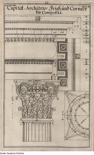 Keywords: Fotothek df tg 0001637 Architektur ^ Bauwesen ^ Säule ^ Kapitell ^ Kompositordnung.jpg Scan Deutsche Fotothek df_tg_0001637 color 2007 MIK-Center Berlin GmbH 88961637 Kap 18 Fig 21 Bl 45 Nürnberg Kapitell Architrav Fries und Karnies der Säule der Kompositordnung Papier Kupferstich 31 7 x 19 cm Architektur Bauwesen Säule Kapitell Kompositordnung ppn26553190X 1698 Druck Deutsche Fotothek gefördert von der Deutschen Forschungsgemeinschaft Projekt Technikgeschichte 16 /17 Jh Verwalter Dresden Sächsische Landesbibliothek - Staats- und Universitätsbibliothek Dresden Archit 188 Herstellung Herstellung Endter Verleger aus Palladio Andreas Böckler Georg Andreas Hrsg Buch Die Baumeisterin Pallas Oder Der in Teutschland entstandene Palladius das ist Des vortrefflich-Italiänischen Baumeisters Andreae Palladii Zwey Bücher Von der Baukunst Deren Erstes I Von denen Materialien die zu dem Bauen insgemein gehören Das Zweyte tractiret I Von denen Zierrathen der gemeinen Gebäue Das XVIII Capitel Von dem Ordine Composito SLUB Archit 188 Fotothek-License PD-old-100 Scans Old Manuscripts from the Deutsche Fotothek |
