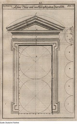 Keywords: Fotothek df tg 0001641 Architektur ^ Bauwesen ^ Tür.jpg Scan Deutsche Fotothek df_tg_0001641 color 2007 MIK-Center Berlin GmbH 88961641 Kap 26 Fig 25 Bl 56 Nürnberg Tür mit Zierrat Papier Kupferstich 28 5 x 18 5 cm Architektur Bauwesen Tür ppn26553190X 1698 Druck Deutsche Fotothek gefördert von der Deutschen Forschungsgemeinschaft Projekt Technikgeschichte 16 /17 Jh Verwalter Dresden Sächsische Landesbibliothek - Staats- und Universitätsbibliothek Dresden Archit 188 Herstellung Herstellung Endter Verleger aus Palladio Andreas Böckler Georg Andreas Hrsg Buch Die Baumeisterin Pallas Oder Der in Teutschland entstandene Palladius das ist Des vortrefflich-Italiänischen Baumeisters Andreae Palladii Zwey Bücher Von der Baukunst Deren Erstes I Von denen Materialien die zu dem Bauen insgemein gehören Das Zweyte tractiret I Von denen Zierrathen der gemeinen Gebäue Das XXVI Capitel Von den Zierrathen der Thüren und Fenster SLUB Archit 188 Fotothek-License PD-old-100 Scans Old Manuscripts from the Deutsche Fotothek |