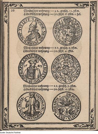 Keywords: Fotothek df tg 0002308 Geldwesen ^ Münzwesen ^ Münze ^ Taler.jpg Scan Deutsche Fotothek df_tg_0002308 color 2007 MIK-Center Berlin GmbH 88962308 26 Leipzig Taler der Herzöge von Mecklenburg Papier Holzschnitt 17 7 x 13 cm Geldwesen Münzwesen Münze Taler ppn266173098 1573 Druck Deutsche Fotothek gefördert von der Deutschen Forschungsgemeinschaft Projekt Technikgeschichte 16 /17 Jh Verwalter Dresden Sächsische Landesbibliothek - Staats- und Universitätsbibliothek Dresden Hist Sax M 191 misc 4 Herstellung Rhambau Johann Drucker Herstellung Stürmer Verleger aus Stürmer Wolf Buch Vortzeichnus und Gepräge der Groben und Kleinen Müntzsorten Welcher sich die Churfürsten Fürsten und Stende in dem Obern Sächssischen Krais vermöge des Heiligen Reichs Müntzordnung und darauff ervolgten Krais und Probationtägen vorglichen Darinne anfangs die Guten Taler so hinfüro geng und gebe sein sollen Und dann volgents auch die Groben und Kleinen geringen Valuirten Sorten zubefinden so auff den Bruch in die vorordente Wechssel geantwortet werden sollen Nachvolgende Taler/ so des Heiligen Reichs Müntzordnung ungemes/ und in der Prob nicht bestanden/ sind werdt wie uber ein jedern verzeichnet SLUB Hist Sax M 191 misc 4 Fotothek-License PD-old-100 Coins of the Holy Roman Empire Vortzeichnus und Gepräge der Großen und Kleinen Müntzsorten 1573 |
