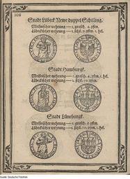 Keywords: Fotothek df tg 0002390 Geldwesen ^ Münzwesen ^ Münze ^ Doppelschilling ^ Schilling.jpg Scan Deutsche Fotothek df_tg_0002390 color 2007 MIK-Center Berlin GmbH 88962390 108 Leipzig Doppelschilling der Stadt Lübeck; Doppelschilling der Stadt Hamburg; Doppelschilling der Stadt Lüneburg Papier Holzschnitt 17 7 x 13 cm Geldwesen Münzwesen Münze Doppelschilling Schilling ppn266173098 1573 Druck Deutsche Fotothek gefördert von der Deutschen Forschungsgemeinschaft Projekt Technikgeschichte 16 /17 Jh Verwalter Dresden Sächsische Landesbibliothek - Staats- und Universitätsbibliothek Dresden Hist Sax M 191 misc 4 Herstellung Rhambau Johann Drucker Herstellung Stürmer Verleger aus Stürmer Wolf Buch Vortzeichnus und Gepräge der Groben und Kleinen Müntzsorten Welcher sich die Churfürsten Fürsten und Stende in dem Obern Sächssischen Krais vermöge des Heiligen Reichs Müntzordnung und darauff ervolgten Krais und Probationtägen vorglichen Darinne anfangs die Guten Taler so hinfüro geng und gebe sein sollen Und dann volgents auch die Groben und Kleinen geringen Valuirten Sorten zubefinden so auff den Bruch in die vorordente Wechssel geantwortet werden sollen Nachvolgende Taler/ so des Heiligen Reichs Müntzordnung ungemes/ und in der Prob nicht bestanden/ sind werdt wie uber ein jedern verzeichnet SLUB Hist Sax M 191 misc 4 Fotothek-License PD-old-100 Coins of the Holy Roman Empire Vortzeichnus und Gepräge der Großen und Kleinen Müntzsorten 1573 |