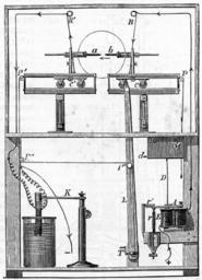 Keywords: Foucault's regulator.jpg en Foucault constructed in 1858 the apparatus shown in Fig 426 taken from La Lumière Électrique The two carbons a and b are arranged horizontally fixed upon the rollers c c ² The two springs R R ² tend to move the carbons towards each other and are connected by means of a string running over the pulley P with it so that the motion can take place only when the clockwork M also moves The lever L and the string P ² P ² ² P ² ² ² are so arranged that c and c ² move at the same time only c ² having the negative carbon moves much more slowly than c The electric current before it enters the carbons has to pass the electro-magnet E To the armature A which is movable about r the rod D is fastened; and according to the position which the armature has it will liberate or stop the clockwork The spring r tends to lift the armature from the electro-magnet By means of the catch d the clockwork may be stopped by the hand The voltameter K compensates for variations in the strength of current ; increasing or diminishing the resistance by allowing the plates to take different positions in the fluid When the carbons a and b are at the right distance from each other the current will have its normal strength and the electro-magnet attracts the armature A In this position the rod D stops the clockwork and the carbons remain stationary If the distance of the carbons by means of their consumption becomes too large i e increases the resistance in the circuit the spring r overcomes the force of attraction of the magnet E and the annature A is lifted off; the rod D no longer stops the clockwork and c c ² can move towards each other until the resistance of the circuit has its original value and the arc has its normal length The current will then have its original strength and cause the electro- magnet E to attract the armature A again 1886 Fig 426 at http //www archive org/stream/electricityinse01wormgoog page/n489/mode/1up page 451 in Electricity in the service of man by Alfred Ritter von Urbanitzky edited with copious additions by Richard Wormell Published by Cassell Company 1886 Unknown illustrator PD-old-100 Arc lamps Scans from 'Electricity in the service of man' 1886 |