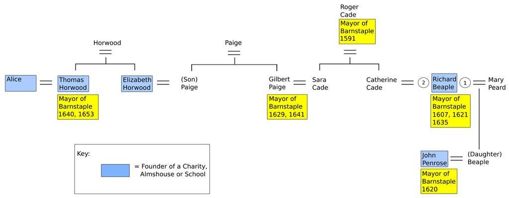 Keywords: FoundersOfBarnstapleCharities 17thCentury.png en Diagram showing familial connections between the founders of the principal charities almshouses and schools in or around the town of Barnstaple Devon in the 17th century Namely Thomas Horwood founded Horwood's Almshouses in Church Lane A contemporary tablet above the door is inscribed This almshous was founded and endowed by the worshjpful Thomas Horwood Merchant twice mayor of this towne who was a worthy benefactor and began it in his life finished by his wife Mrs Alice Horwood after his death who of her owne accord added the adioyning free schoole and endowed it for 20 poore children for ever 1659 abi et tu fac similiter i e go and do likewise Alice Horwood widow of Thomas Horwood foundress of a girls' school situated next to her husband's almshouse A slate tablet affixed in 1917 above the front door to the present Old School Coffee Shop in Church Lane is inscribed A H 1659 This school for 20 poor maids was founded and built by Alice Horwood Restored 1917 and shows the arms of Horwood Azure a chevron ermine between three hens passant argent winged sable wattled gules in chief a mullet argent for difference Elizabeth Horwood Mrs Paige founder of Paige's Almshouses in Church Lane sister of Thomas Horwood and widow of Gilbert I Paige d 1647 twice Mayor of Barnstaple in 1629 and 1641 Richard Beaple 1564-1643 thrice Mayor of Barnstaple in 1607 1621 and 1635 oversaw the building of Penrose's Almshouses and bequeathed Beaple's Gift as follows Richard Beaple by his will bearing date 13th April 1641 gave to his executors £420 to the intent that they should therewith purchase so much land of inheritance as should be of the yearly value of £20 the yearly profits thereof to be bestowed upon four poor people of the new almshouse erected by Mr John Penrose deceased John Penrose d 1624 Mayor of Barnstaple in 1620 son-in-law of Richard Beaple left money for founding of Penrose's Almshouses in Lichdon Street own work Lobsterthermidor <span class signature-talk ></span> 22 04 11 January 2016 UTC 2015 Barnstaple