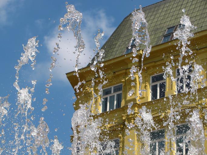 Keywords: fountain water drops building sunny day water wet splash spray liquid rain splashing drops stream
