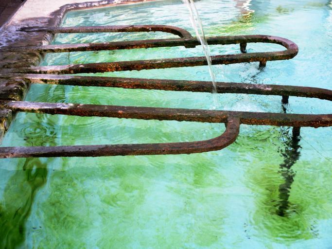 Keywords: fountain water jet water basin flow iron rods stainless mirroring old town diessenhofen thurgau switzerland