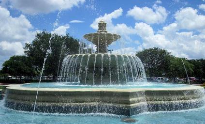Keywords: fountain water water fountain outside outdoors scenic scenery falling water clouds trees