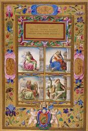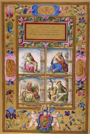 Keywords: Four Evangelists - Google Art Project.jpg This leaf is actually a montage of vellum cuttings excised from one or more service books taken from the Sistine Chapel during the 1798 French occupation of Rome These cuttings were brought to England by Luigi Celotti 1759 “1843 who presumably created the montage and sold it at Christie's on 26 May 1825 lot 87 In the Celotti sale catalogue William Ottley 1771 “1836 listed it under Pope Gregory XIII and attributed it to Giulio Clovio 1498 “1578 It was then in Ottley's own sale at Sotheby's 10 May 1838 lot 243 The dealer Leo Olschki wisely offered the leaf to Morgan who had acquired Clovio's masterpiece the Farnese Hours three years earlier If the portraits are not by Clovio he was then quite old they are certainly by an artist who came under his influence Purchased by Pierpont Morgan from Leo Olschki 1907 Italy probably Rome ca 1572 “85 w277 x h413 mm http //www themorgan org/collections/collections asp id 405 commons date 1572 - 1585 commons medium commons dimensions commons institution commons location commons references commons object_history commons exhibition_history commons credit_line commons inscriptions commons notes commons accession_number commons source commons permission commons other_versions commons zoom core title Four Evangelists core creator Unknown core date dateCreated 1572/1585 core location Italy core format w277 x h413 mm core type Manuscript core relation http //www themorgan org/collections/collections asp id 405 c-089916f9 customtext credit_line Montage with other cuttings possibly from a Gospel Book made for Pope Gregory XIII r 1572 “85 Italy probably Rome ca 1572 “85 google display_date 1572/1585 google is_artproject TRUE google is_gigapixel FALSE google is_secured TRUE google partner/id 00000000089916f9 google partner/name The Morgan Library Museum google picasa_token I5i6VI7xeo2kWulufPEpbhXdJk8 special url_id sQG1vbyoDunB3w special partner/name_no_lang The Morgan Library Museum PD-old-100-1923 Google Art Project works by unknown artist 16th-century illuminated manuscripts Medieval miniatures of four Evangelists Pierpont Morgan Library manuscripts Irises in medieval miniatures Medieval miniatures of peacocks Butterflies in medieval miniatures Coats of arms in medieval miniature Gregorius XIII in art |