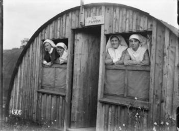 Keywords: blackandwhite monochrome black and white Four nursing sisters look out of the windows of a New Zealand Stationary Hospital building, Wisques, France. The building is shaped like a half round and has a wooden front with a corrrugated iron roof. Above the door is a sign which reads" The Popp Inn". Taken during World War I by Henry Armytage Sanders. Inscriptions: Inscribed - Photographer's title on negative -bottom left: H906. Quantity: 1 b&w original negative(s). Four nursing sisters look out of the windows of the New Zealand Stationary Hospital, Wisques, France. Royal New Zealand Returned and Services' Association :New Zealand official negatives, World War 1914-1918. Ref: 1/2-013482-G. Alexander Turnbull Library, Wellington, New Zealand. natlib.govt.nz/records/22821199 Four nursing sisters look out of the windows of a New Zealand Stationary Hospital building, Wisques, France. The building is shaped like a half round and has a wooden front with a corrrugated iron roof. Above the door is a sign which reads" The Popp Inn". Taken during World War I by Henry Armytage Sanders. Inscriptions: Inscribed - Photographer's title on negative -bottom left: H906. Quantity: 1 b&w original negative(s). Four nursing sisters look out of the windows of the New Zealand Stationary Hospital, Wisques, France. Royal New Zealand Returned and Services' Association :New Zealand official negatives, World War 1914-1918. Ref: 1/2-013482-G. Alexander Turnbull Library, Wellington, New Zealand. natlib.govt.nz/records/22821199 |