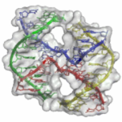 Keywords: Four-way DNA junction.gif Animation showing the structure of a DNA four-way junction also known as Holliday junction taken from the PDB coordinates 467D http //www rcsb org/pdb/explore do structureId 467D The image shows a ribbons-and-stick representation of the atomic coordinates of the structure and as a transparency its molecular surface Author of both the structure and the figure Miguel Ortiz-LombardÃa 2006-11-01 own assumed Molatwork Structural biology Branched DNA structures Animated GIF |