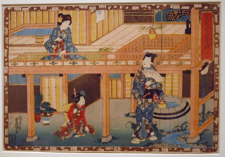 Keywords: Fourteen (5758878857).jpg en <b>Accession Number </b> 2010 17 <b>Display Artist </b> Utagawa Kunisada <b>Display Title </b> Fourteen <b>Series Title </b> His Appearance in Purple Magic Lantern Pictures <b>Suite Name </b> Sono sugata yukari no utsushi-e <b>Creation Date </b> 1848-1850 <b>Height </b> 10 in <b>Width </b> 14 3/4 in <b>Display Dimensions </b> 10 in x 14 3/4 in 25 4 cm x 37 47 cm <b>Publisher </b> Izumiya Ichibei <b>Credit Line </b> Gift of William Hayden Price and Charlene Chatham Price <b>Label Copy </b> Kunisada reworked the black-and-white frontispiece of volume 21 of Inaka Genji into this full-color print He seemed to take delight in picturing the details of the two-story Japanese house with a bathtub on the second floor which received water from the well below by a bucket-and-pulley system Mitsuuji stands in a light cotton kimono by the well looking up at Asagiri who is about to take a bath <b>Label Copy Spanish </b> Kunisada alter el frontispicio en blanco y negro del volumen 21 del Inaka Genji en esta impresin a todo color Parece deleitarse al representar los detalles de la casa japonesa de dos pisos con una tina en el segundo piso la cual se llenaba con el agua del pozo con una polea y una cubeta Mitsuuji est parado junto al pozo en un kimono de algodn ligero mirando a Asagiri quien se dispone a baarse <b>Collection </b> <a href http //www sdmart org/art/our-collection/asian-art rel nofollow >The San Diego Museum of Art</a> 2010-10-28 15 58 43 https //www flickr com/photos/thesandiegomuseumofartcollection/5758878857/ Flickr en thesandiegomuseumofartcollection PD-old-100 Files from the San Diego Museum of Art to be checked Water well pulleys |