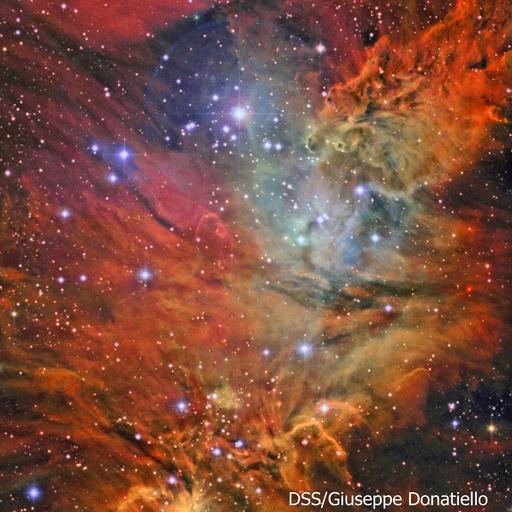 | Keywords: fox fur ngc 2264 ngc2264 fox fur nebula foxfurnebula Fox Fur Nebula Credit: DSS / Giuseppe Donatiello Fox Fur Nebula is a nebula located in Monoceros and included in the NGC 2264 Region. The red colors of this nebula are caused by hydrogen gas that has been stimulated to emit its own light by the copious ultraviolet radiation coming from the hot, blue stars of the cluster. The blue areas are mainly dust clouds that reflect the bluish light of the same stars. The nebula looks like the head of a stole made from the fur of a red fox. Fox Fur Nebula Credit: DSS / Giuseppe Donatiello Fox Fur Nebula is a nebula located in Monoceros and included in the NGC 2264 Region. The red colors of this nebula are caused by hydrogen gas that has been stimulated to emit its own light by the copious ultraviolet radiation coming from the hot, blue stars of the cluster. The blue areas are mainly dust clouds that reflect the bluish light of the same stars. The nebula looks like the head of a stole made from the fur of a red fox. |