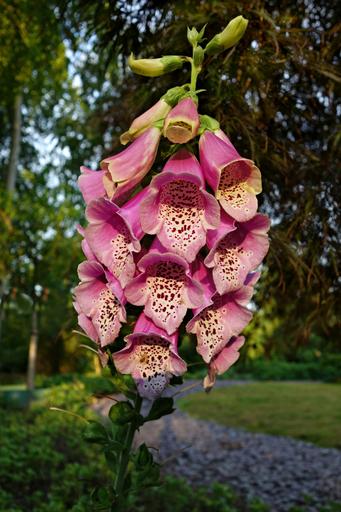 Keywords: foxglove flower purpurea digitalis purpurea petal bell shaped blossom bloom herb medicinal health medicine nature botany park pink green sunlight bright