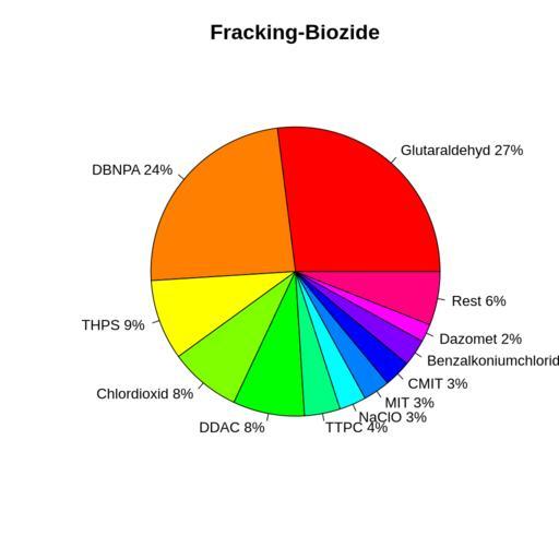 Keywords: Fracbiozide.svg opaque en Frequency of use of fracking biocides in the USA 2 2-Dibrom-3-nitrilpropionamid<br /> THPS Tetrakis hydroxymethyl phosphoniumsulfat<br /> DDAC Didecyldimethylammoniumchlorid<br /> TTPC Tributyltetradecylphosphoniumchlorid<br /> NaClO Natriumhypochlorit<br /> MIT Methylisothiazolinon<br /> CMIT Chlormethylisothiazolinon own based http //pubs acs org/doi/suppl/10 1021/es503724k/suppl_file/es503724k_si_001 pdf // Data collected from FracFocus is pertinent to wells fractured after January 01 2011 2014-12-17 Kopiersperre <span class signature-talk ></span> PD-own v glutaraldehyd <- 27 DBNPA <- 24 THPS <- 9 Chlordioxid <- 8 DDAC <- 8 TTPC <- 4 NaClO <- 3 MIT <- 3 CMIT <- 3 Benzalkoniumchlorid <- 3 Dazomet <- 2 total <- glutaraldehyd + DBNPA + THPS + Chlordioxid + DDAC + TTPC + NaClO + MIT + CMIT + Benzalkoniumchlorid + Dazomet rest <- 100-total pct <- c glutaraldehyd DBNPA THPS Chlordioxid DDAC TTPC NaClO MIT CMIT Benzalkoniumchlorid Dazomet rest lbls <- c Glutaraldehyd DBNPA THPS Chlordioxid DDAC TTPC NaClO MIT CMIT Benzalkoniumchlorid Dazomet Rest lbls <- paste lbls pct lbls <- paste lbls sep pie pct labels lbls col rainbow length lbls main Fracking-Biozide cex 0 8 dev copy svg fracbiozide svg dev off User Kopiersperre Diagrams Hydraulic fracturing Biocides |