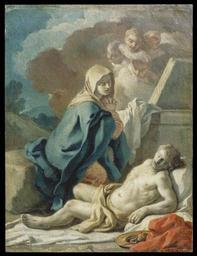 Keywords: Francesco de Mura - Pietà - Walters 371125.jpg Walters Art Museum artwork Q18748496 Creator Francesco de Mura A Pietà meaning compassion in Italian is the image of the Virgin Mary mourning her dead son In the Bible she mourns along with others Isolating her focuses the viewer's attention on her suffering and her compassion for her son's suffering thereby offering the ultimate example for pious Catholics The idealized muscular body of the dead Christ is set off against the stately pyramidal figure of Mary in her voluminous robe and presented to the viewer so that he or she like the Virgin Mary can meditate on Christ's sacrifice The silvery tones like the ahistorical setting lend an aura of timelessness to the subject Zeri Italian paintings in the Walters Art Gallery 437 549 ca 1725 1730 Baroque Oil on canvas Painted surface cm 64 49 3 accession number 37 1125 7018 Don Marcello Massarenti Collection Rome date and mode of acquisition unknown 1897 catalogue no 165 as Guido Reni Henry Walters city Baltimore Walters Art Museum Henry Walters Acquired by Henry Walters with the Massarenti Collection 1902 place of origin Naples Italy Walters Art Museum license 2D Baroque paintings in the Walters Art Museum Francesco de Mura Media contributed by the Walters Art Museum needs category review |